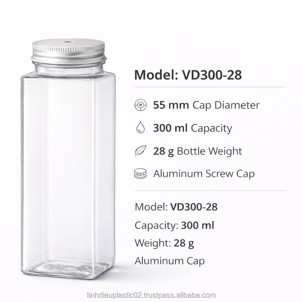 ขวดพลาสติก PET ทรงเหลี่ยม ขนาด 300 มล. พร้อมฝาเกลียวขนาด 55 มม. สำหรับบรรจุน้ำผลไม้ ชา กาแฟ ส่งออกเอเชีย อเมริกา