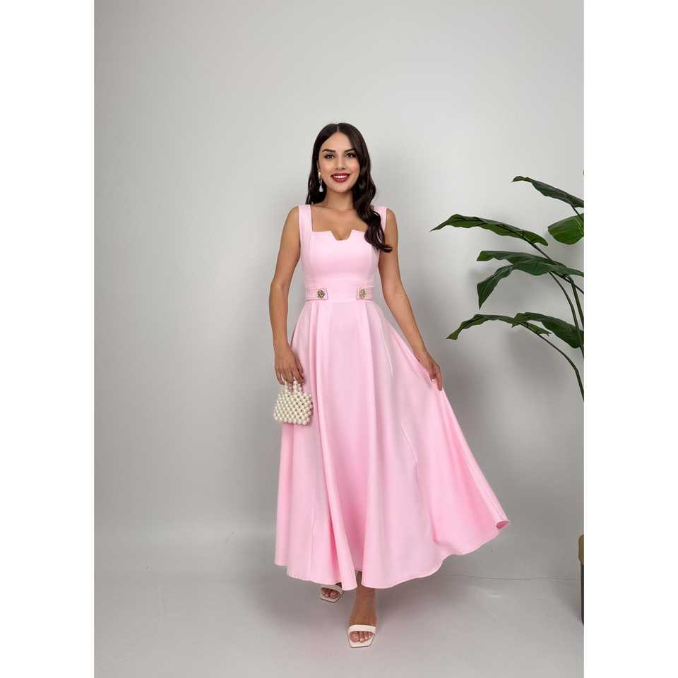 3023 เดรสผูกกระดุม ผ้าซาติน ทรงเอ คอเหลี่ยม เอวธรรมชาติ สีชมพูหวาน