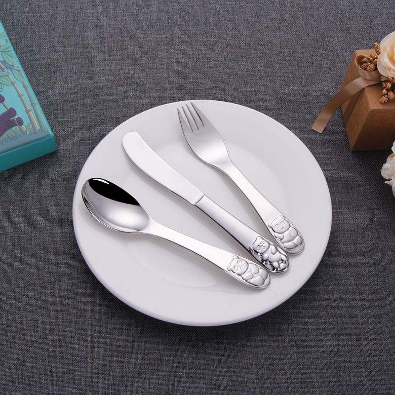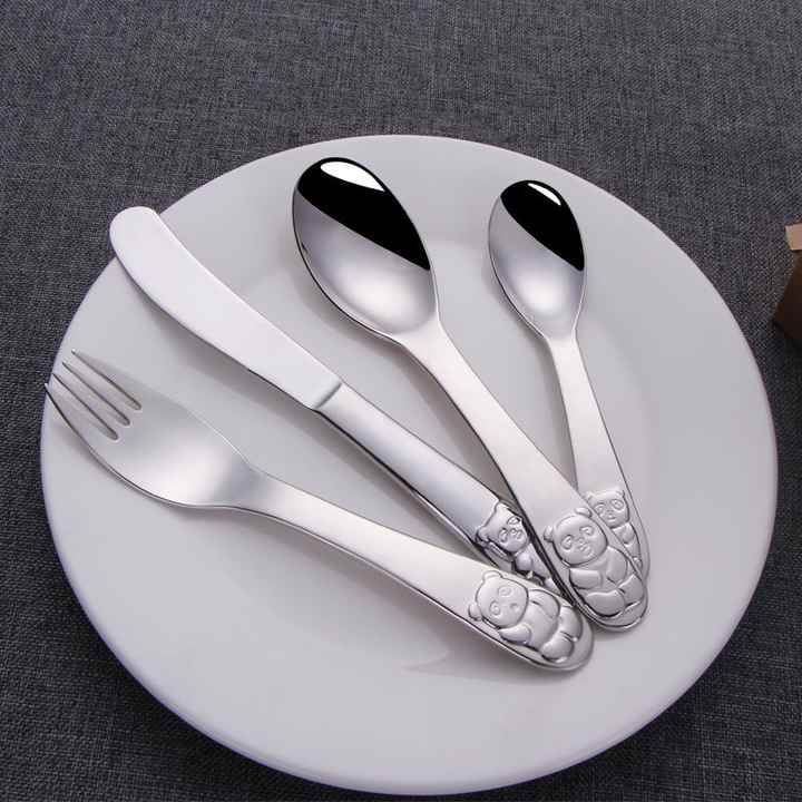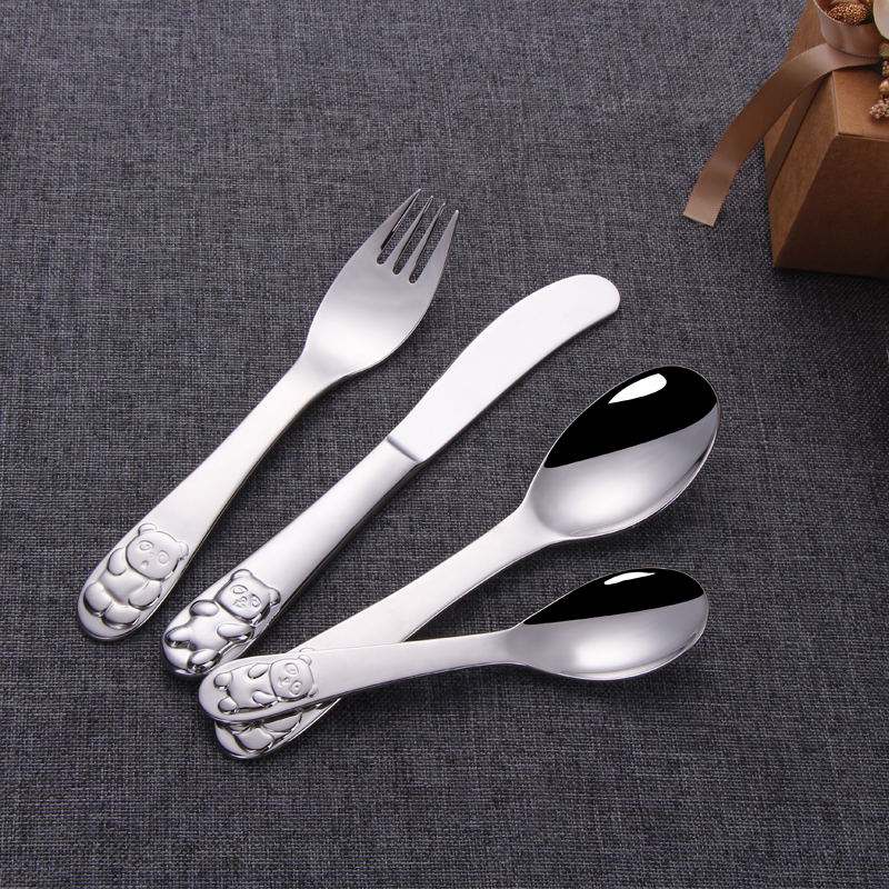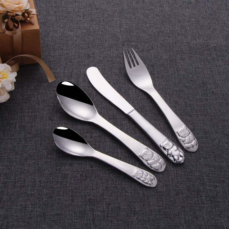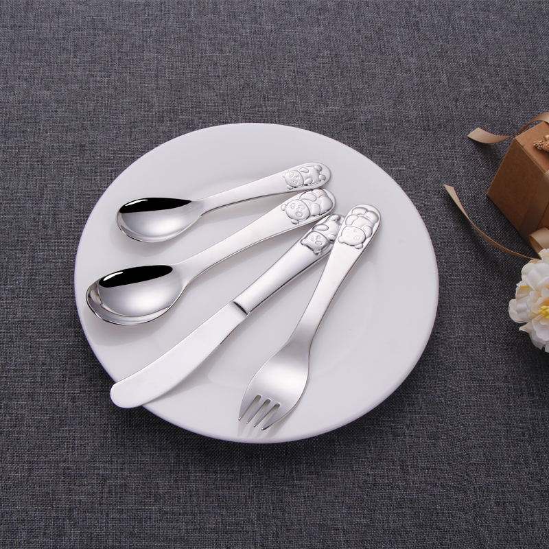 ชุดช้อนส้อม4ชิ้นสำหรับเด็กทำจากกระจกขัดเงารูปการ์ตูนน่ารักบนด้ามจับ304