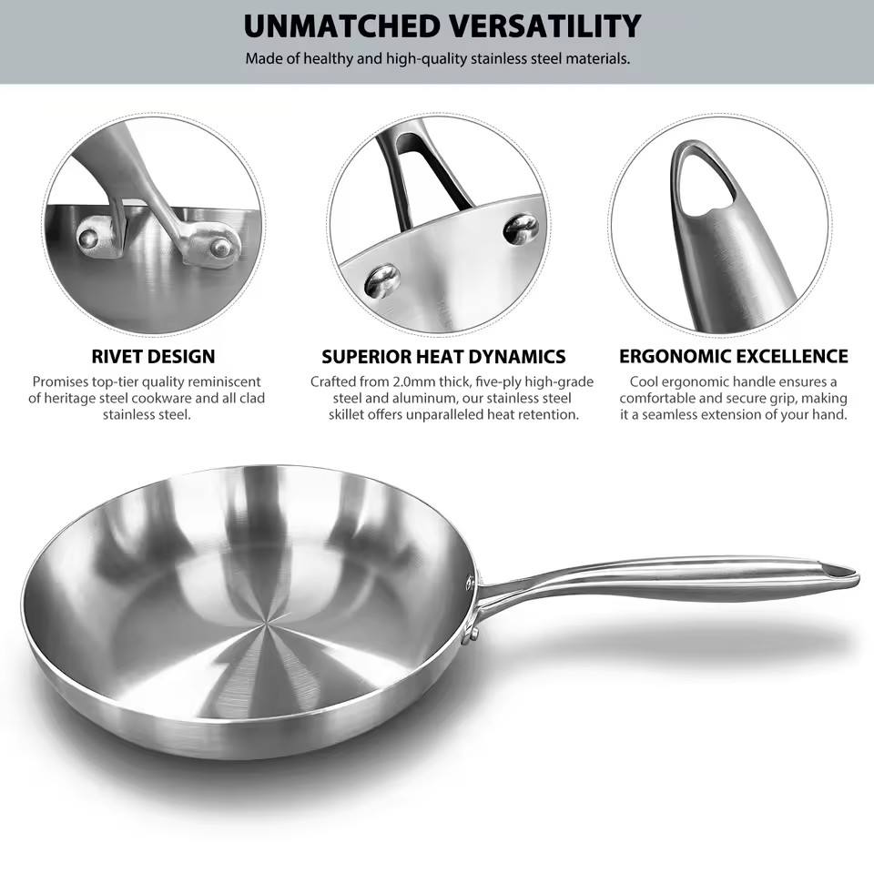 กระทะสแตนเลส 304 กระทะทอดสเต็กแบบไม่ติดกระทะ เครื่องครัวแบบไม่เคลือบสำหรับเตาแก๊สและเตาแม่เหล็กไฟฟ้า