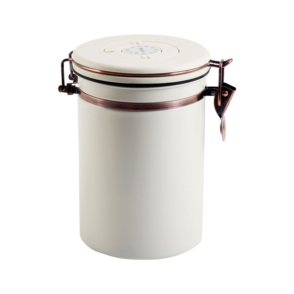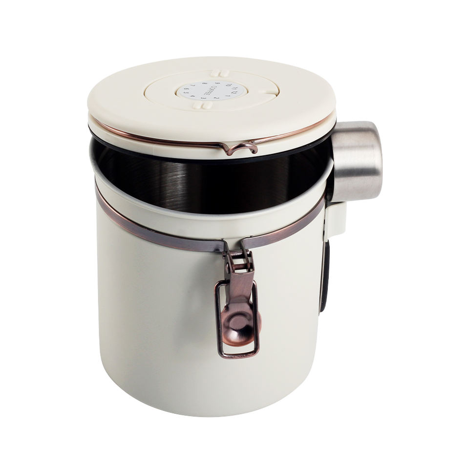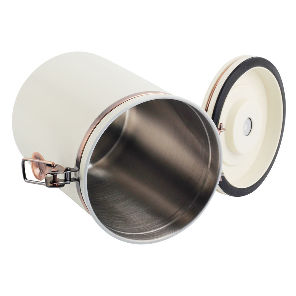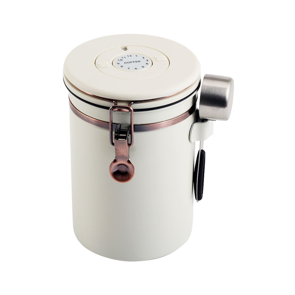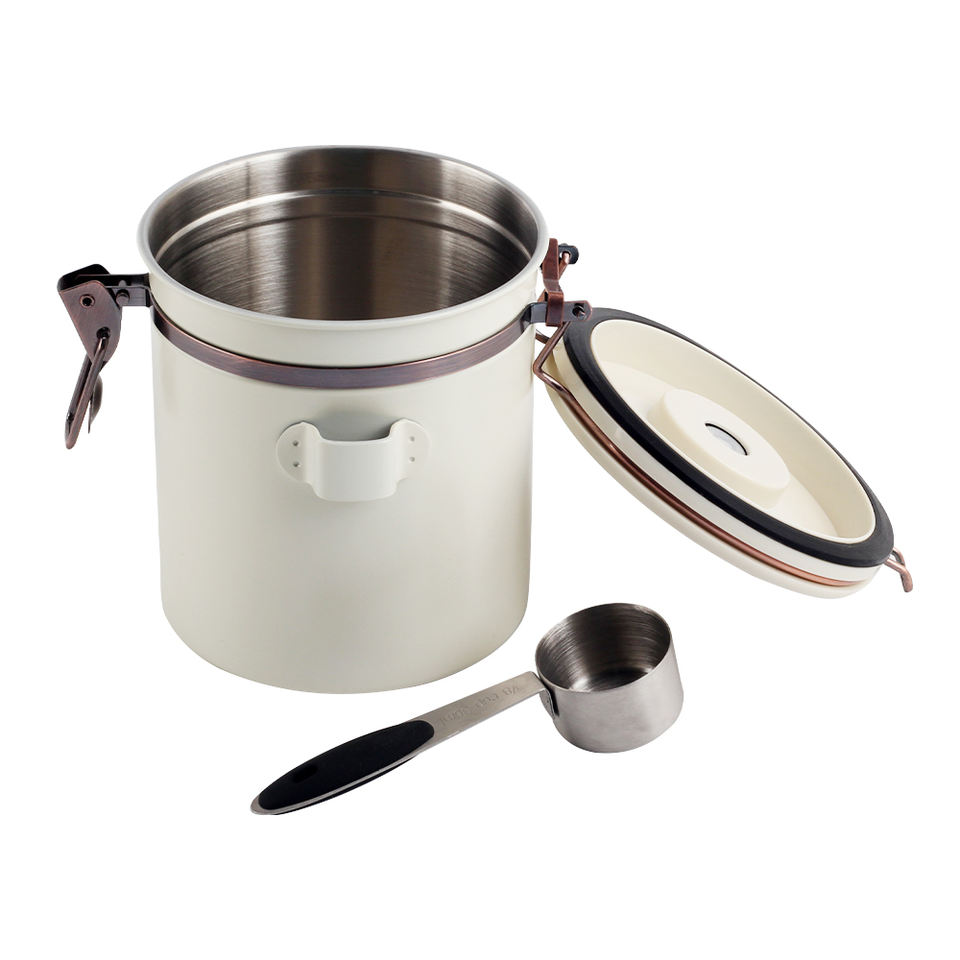 กระป๋องเก็บกาแฟชาสแตนเลส 304 แบบโมเดิร์น ปิดสนิท ทนทาน ใช้ได้หลากหลาย พร้อมฝาปิดแบบหนีบและช้อน เป็นมิตรกับสิ่งแวดล้อม