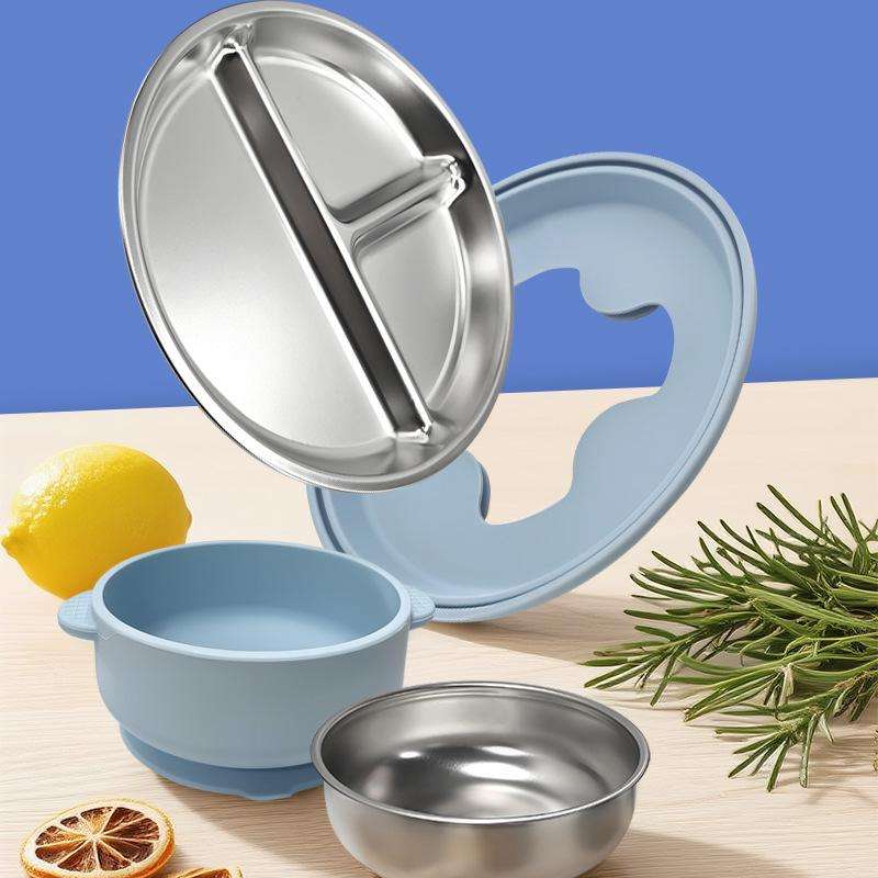 ชุดอาหารเด็ก 4 ชิ้น ทำจากสแตนเลส 304 พร้อมซิลิโคน ปรับแต่งได้ จาน ชาม ซิลิโคนแบบถอดได้ ปลอดสาร BPA