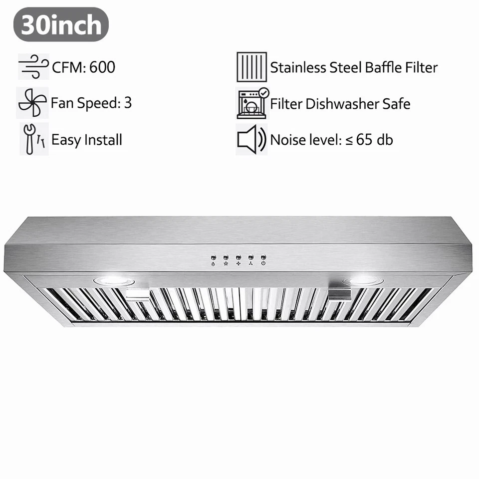 พัดลมดูดควันใต้ตู้ครัว 30 นิ้ว 3 ระดับความเร็ว 600 CFM พร้อมไฟ LED รุ่นใหม่