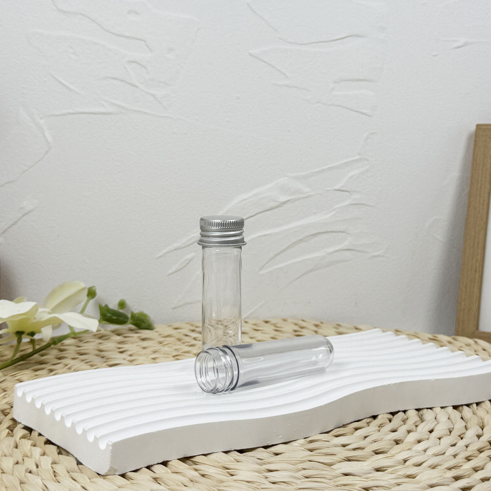 หลอดทดลองพลาสติกใสขนาด30มล. 40มล. 50มล. 60มล. ภาชนะใส่ลูกอมพร้อมฝาเกลียวอลูมิเนียม