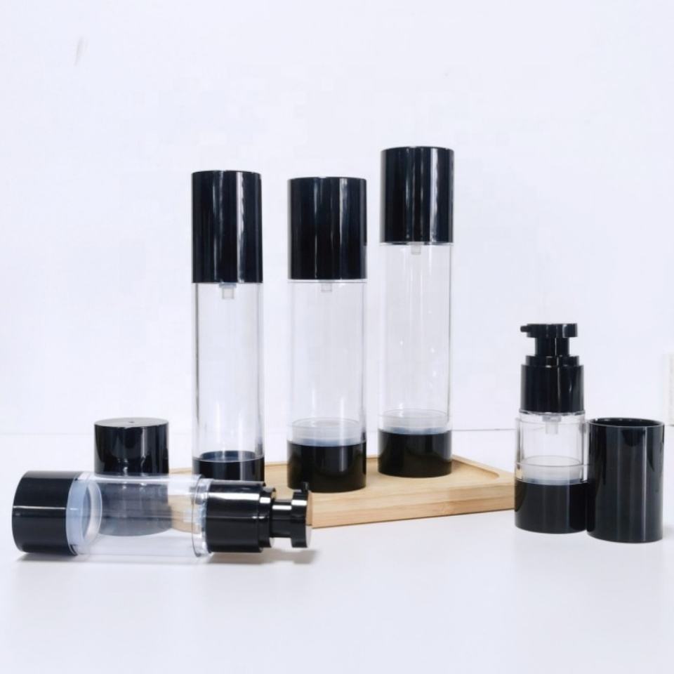 ขวดรองพื้นแบบใสสีดำขนาด 30 มล. 50 มล. 100 มล. ขวดปั๊มโลชั่นพลาสติกแบบสุญญากาศพร้อมโลโก้สั่งทำสำหรับเครื่องสำอาง