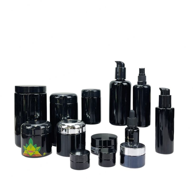 ขวดแก้วสีม่วงเข้มสำหรับเครื่องสำอางขนาด 30 มล. 50 มล. 60 มล. 100 มล. พร้อมฝาปั๊มสีดำ