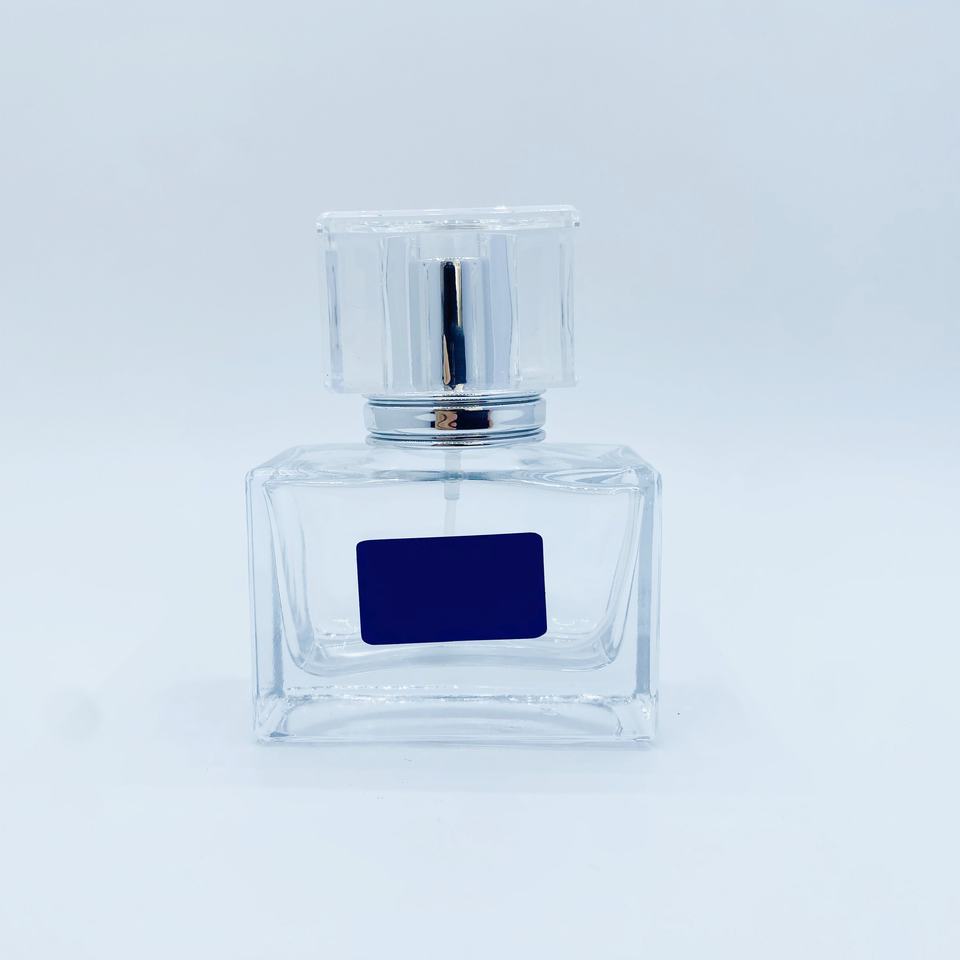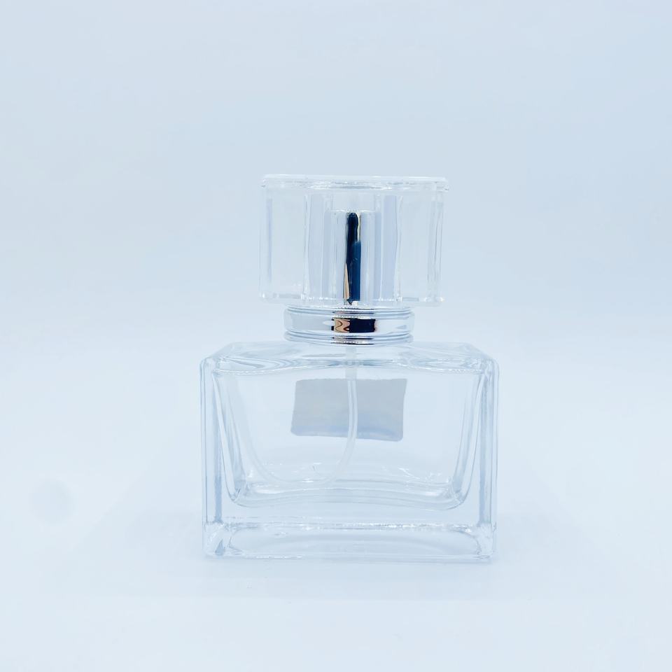 ขวดน้ำหอมแก้วใสทรงสี่เหลี่ยมขนาด 30 มล. พร้อมฝาพลาสติกใสและขวดแก้วสำหรับบรรจุน้ำหอมในผลิตภัณฑ์ดูแลส่วนบุคคล