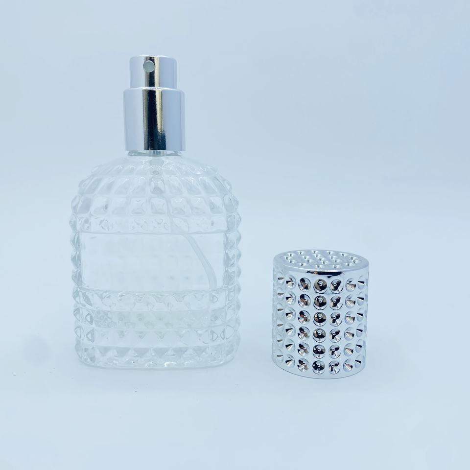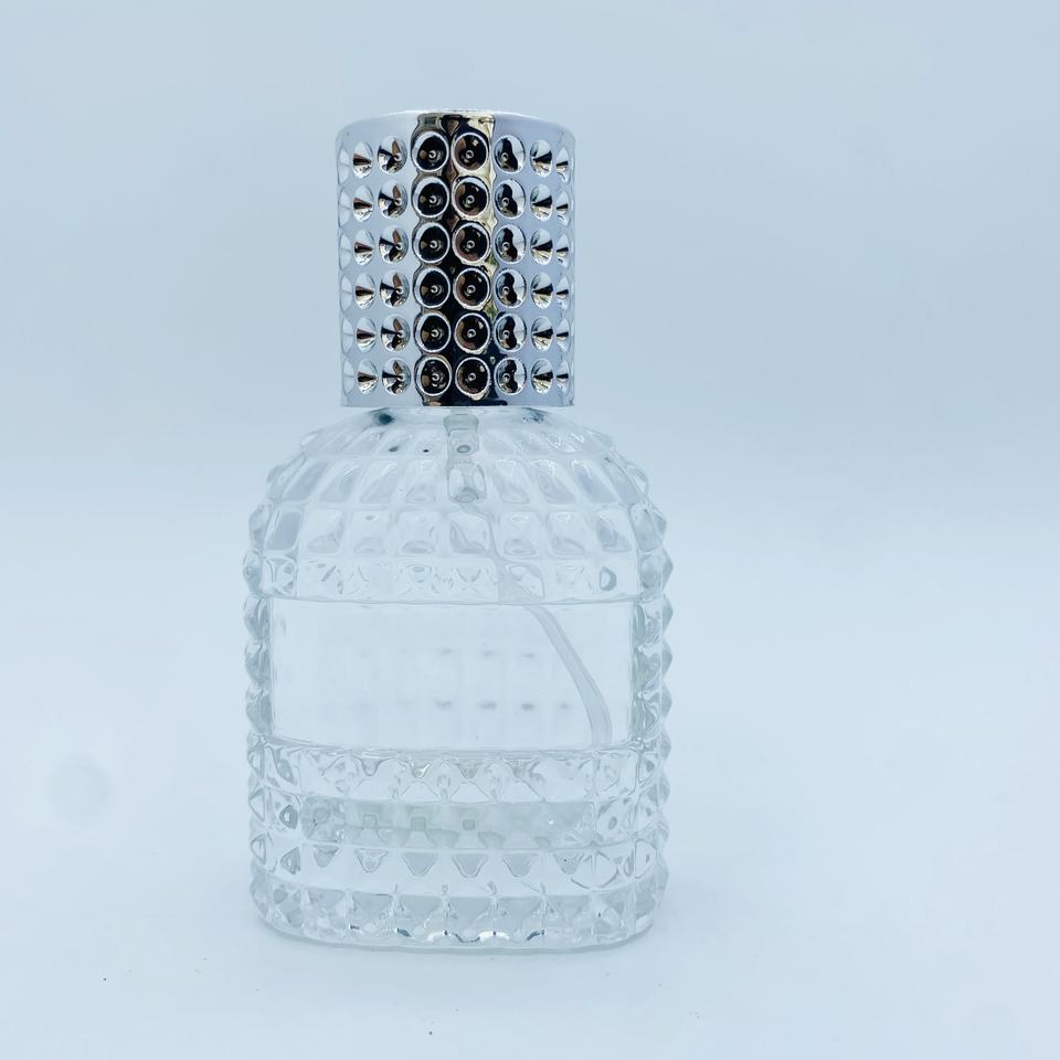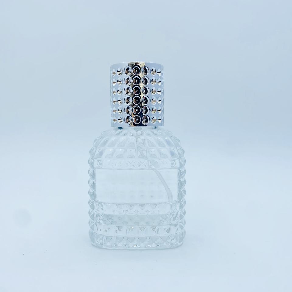 ขวดแก้วใสทรงรีขนาด 30 มล. แบบมีลายนูน สำหรับใส่เครื่องหอม ฝาพลาสติก เติมได้ เหมาะสำหรับการดูแลส่วนบุคคล