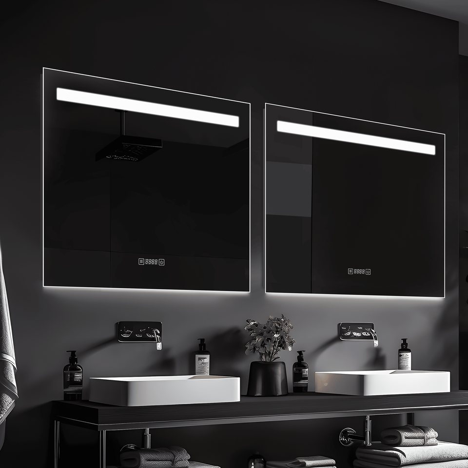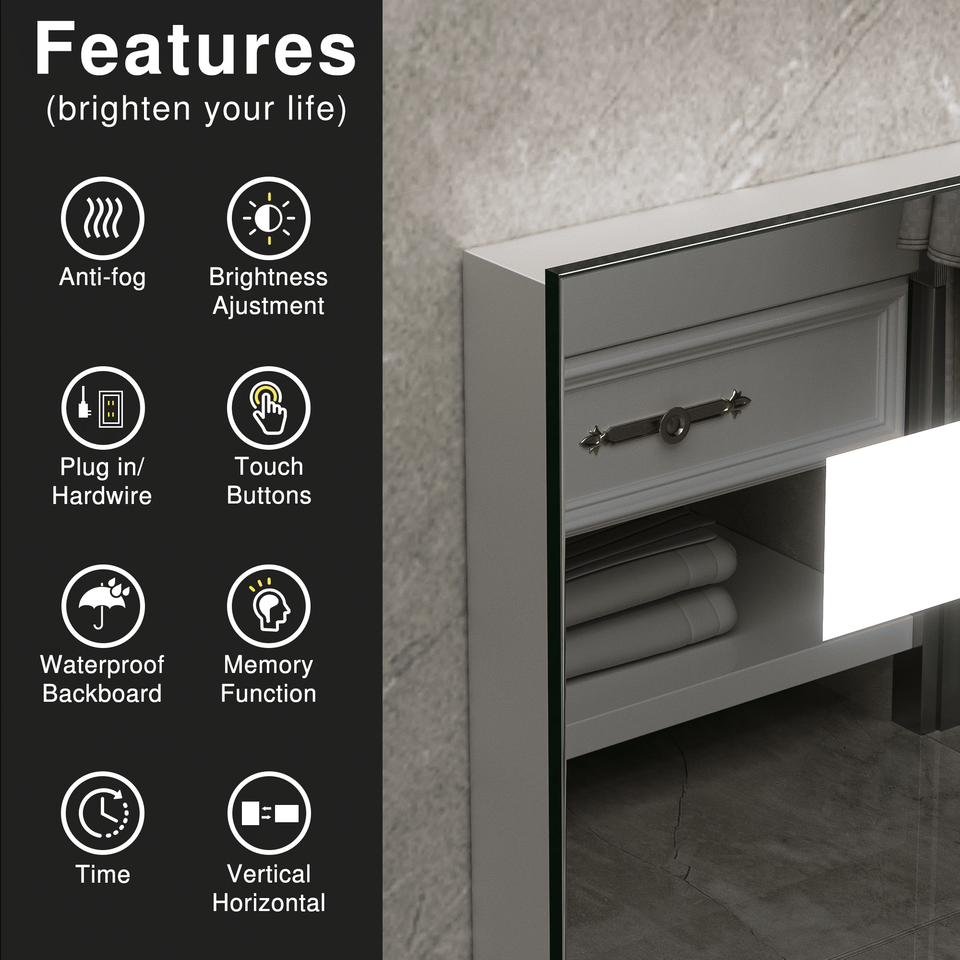 กระจกติดผนังห้องน้ำช่องแนวนอน LED, 31 "* 24" หรูหราพร้อมนาฬิกากันหมอกออกแบบลายหอยเชลล์สำหรับแขวน