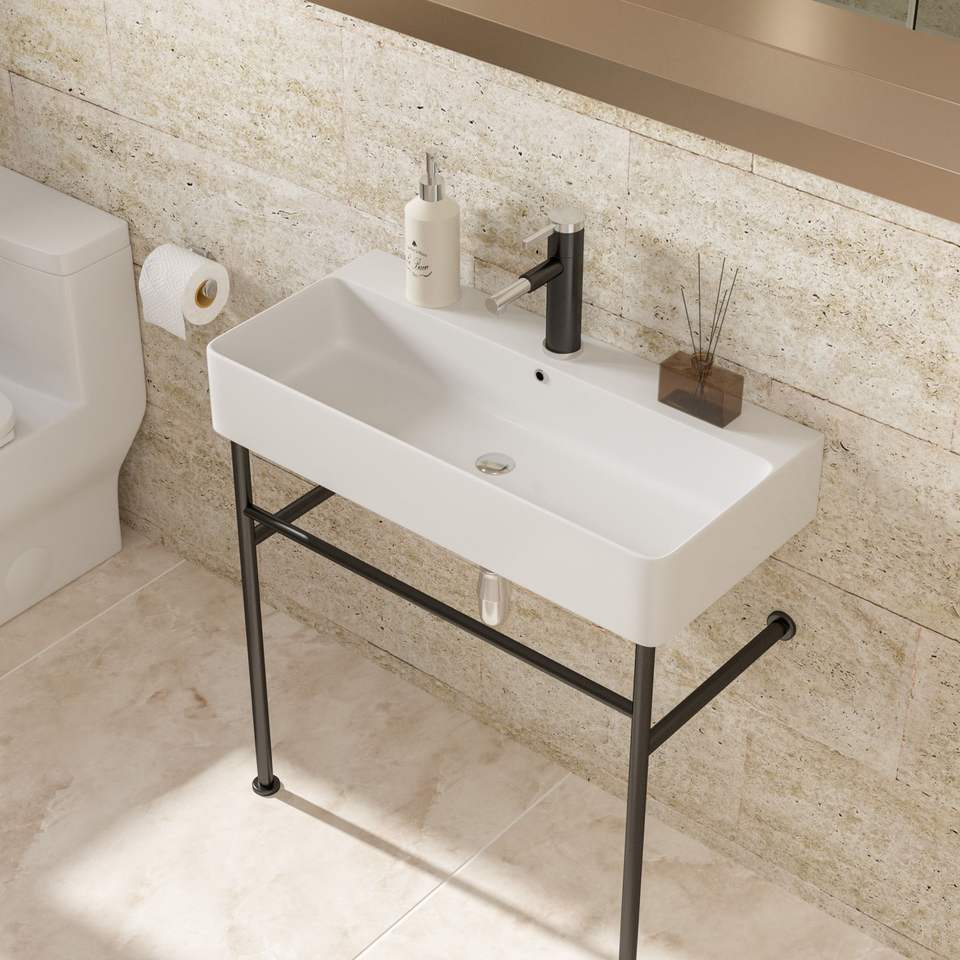 31.5 \ "คอนโซลห้องน้ำอ่างล้างหน้าเซรามิกสีขาวขาสีดำล้น