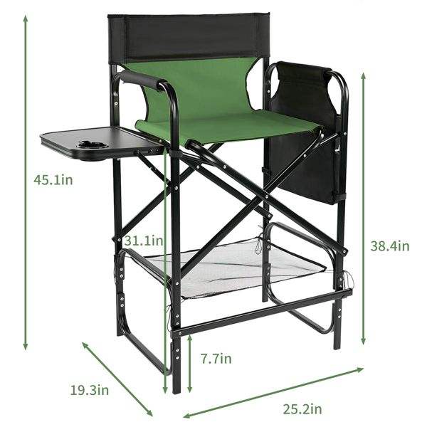 เก้าอี้ผู้กำกับแบบพกพาสูง 31 นิ้ว พร้อมที่วางแก้ว ที่พักเท้าในตัว และโต๊ะข้างพร้อมช่องเก็บของ เก้าอี้พับสำหรับตั้งแคมป์แบบปรับระดับความสูงได้