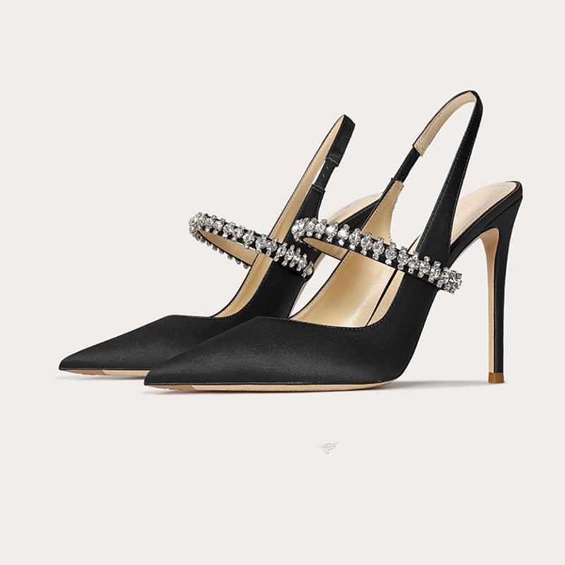 รองเท้าส้นเข็มแบบเปิดส้น รุ่นใหม่ปี 2026 สำหรับผู้หญิง ไซส์ 32-45 ทำจากผ้าไหมซาตินสีนู้ด ประดับด้วยคริสตัล สายรัดข้อเท้า หัวแหลม ส้นสูง 6-8 ซม.