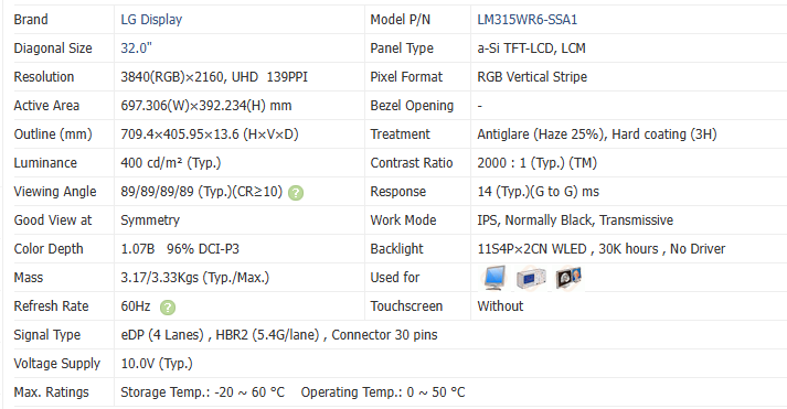 โมดูลจอแสดงผล TFT LCD ขนาด 32 นิ้ว รุ่น LM315WR6-SSA1 ความละเอียด 3840x2160 139 PPI พร้อมพอร์ต LVDS 30 พิน สำหรับจอภาพ