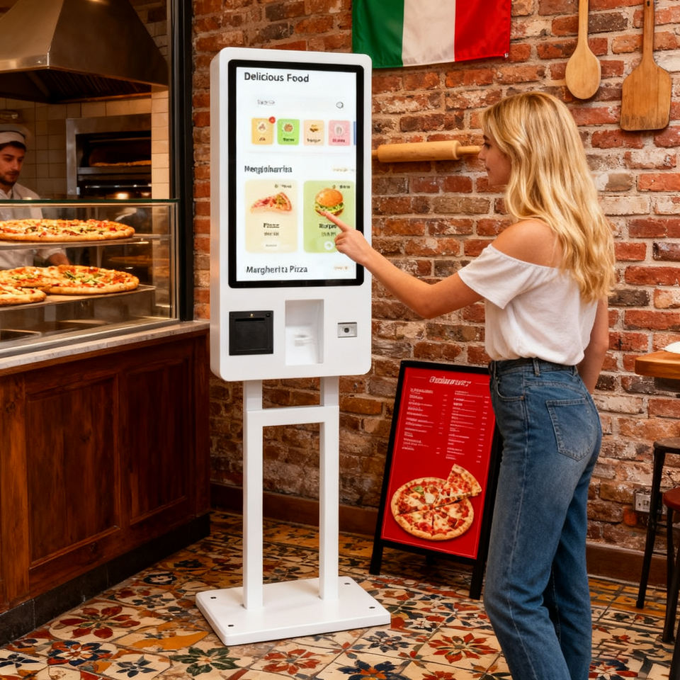 ระบบ POS แบบตั้งพื้นพร้อมหน้าจอสัมผัส LED ขนาด 32 นิ้ว สำหรับร้านอาหาร ใช้ในร่ม รองรับ SDK บริการตนเองสำหรับสั่งอาหารและชำระเงิน ระบบแอนดรอยด์/วินโดวส์