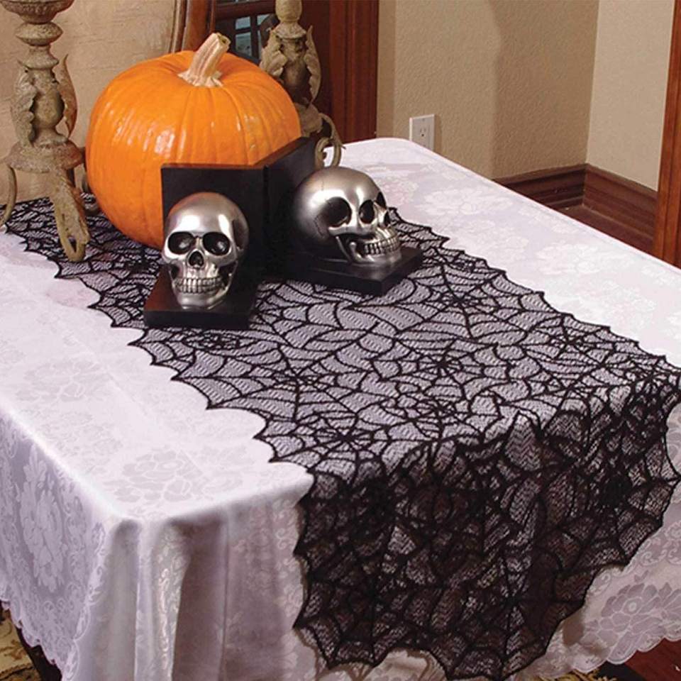 ชุดผ้าปูโต๊ะลายใยแมงมุมลายฮาโลวีน32ชิ้นชุดผ้าปูโต๊ะลูกไม้สีดำคลุมโต๊ะเตาผิงผ้าพันคอสำหรับปาร์ตี้28ชิ้นของตกแต่งบนโต๊ะอาหาร