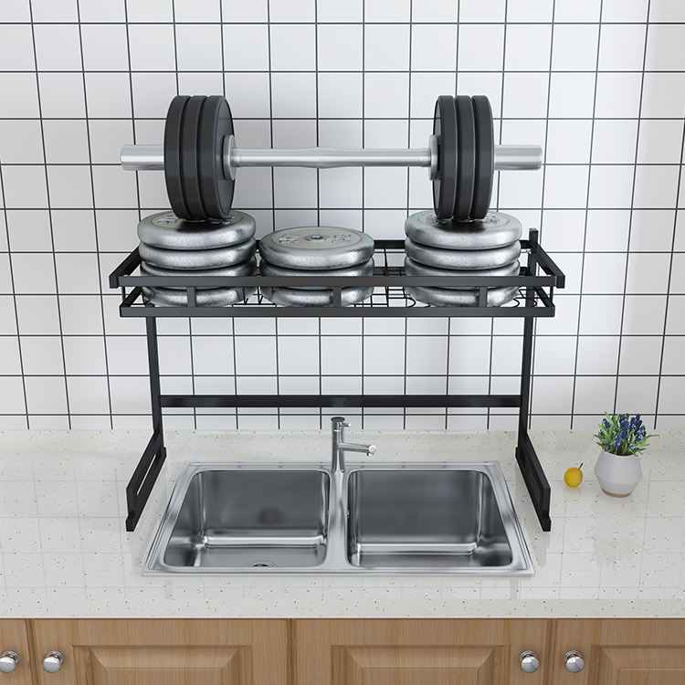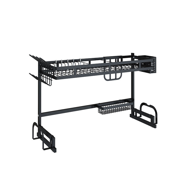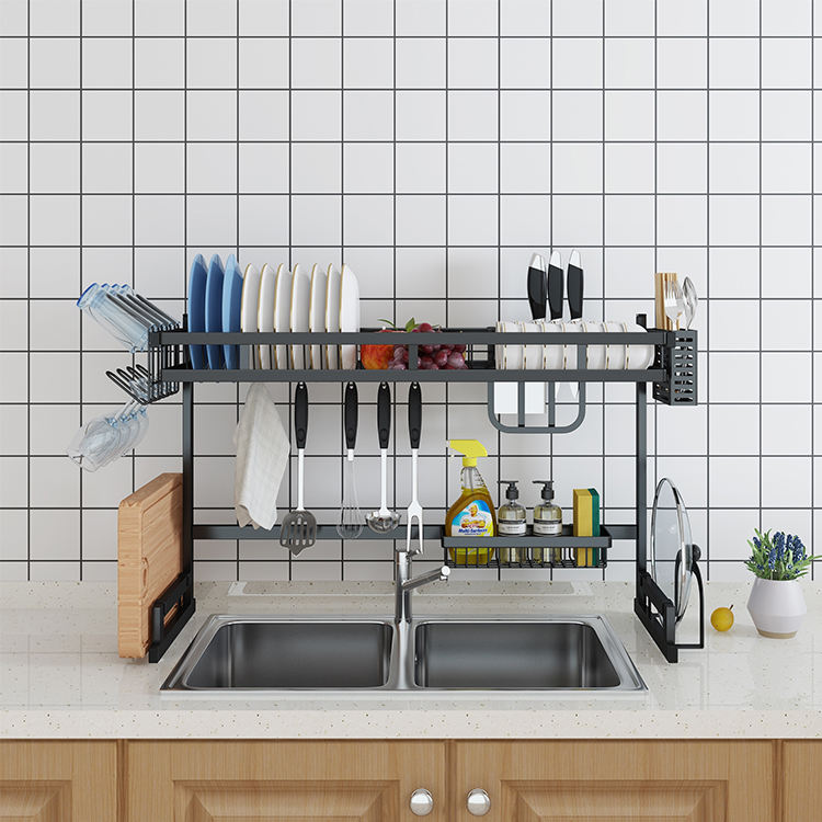 33.46นิ้วสีดำสีเงินห้องครัวสแตนเลส2ชั้นจานอบแห้งการจัดเก็บกว่าแห้งอ่างล้างจานชั้นวาง