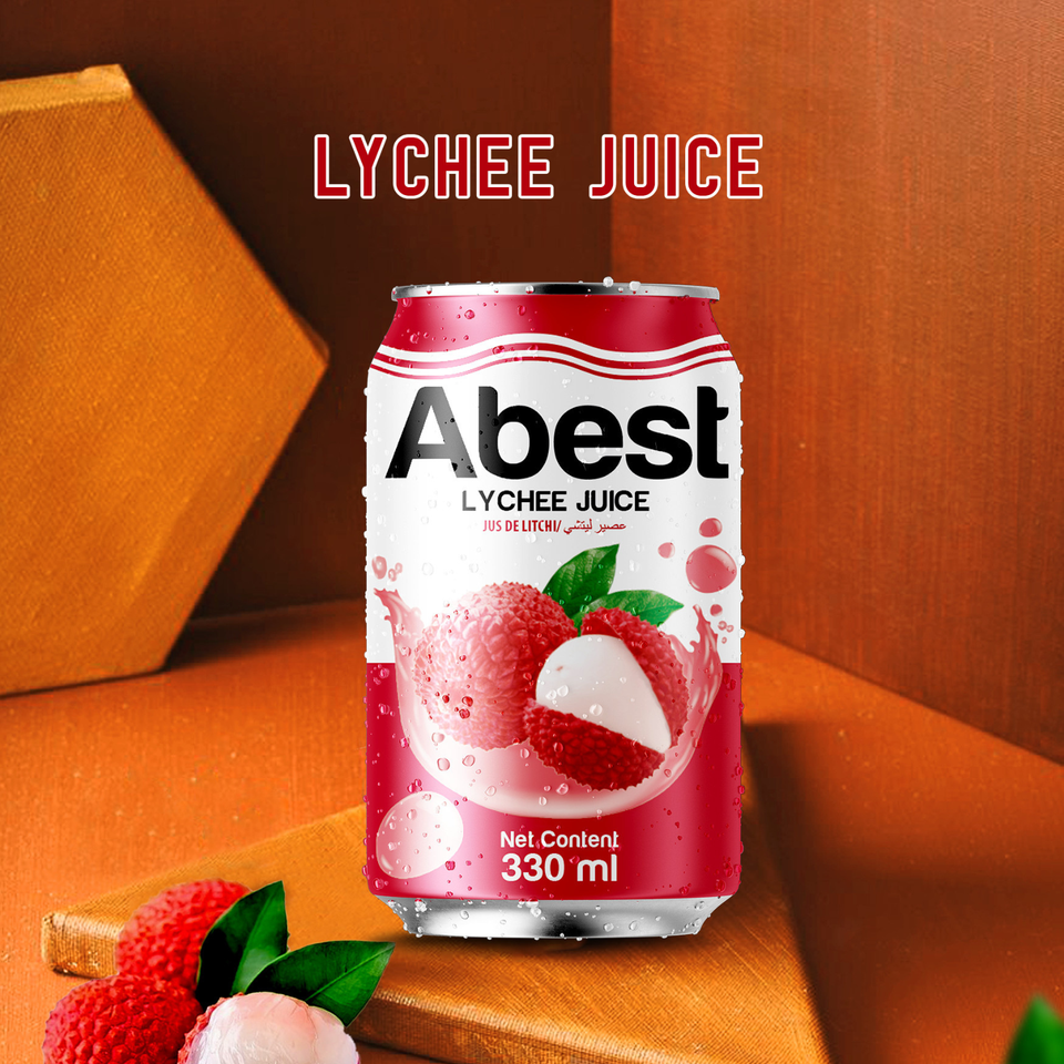 น้ำลิ้นจี่ 330 มล. เครื่องดื่มได้รับการรับรองฮาลาล ผู้ผลิต A&B น้ำอัดลมน้ำตาลธรรมชาติ น้ำลิ้นจี่จากเวียดนาม ODM/OEM