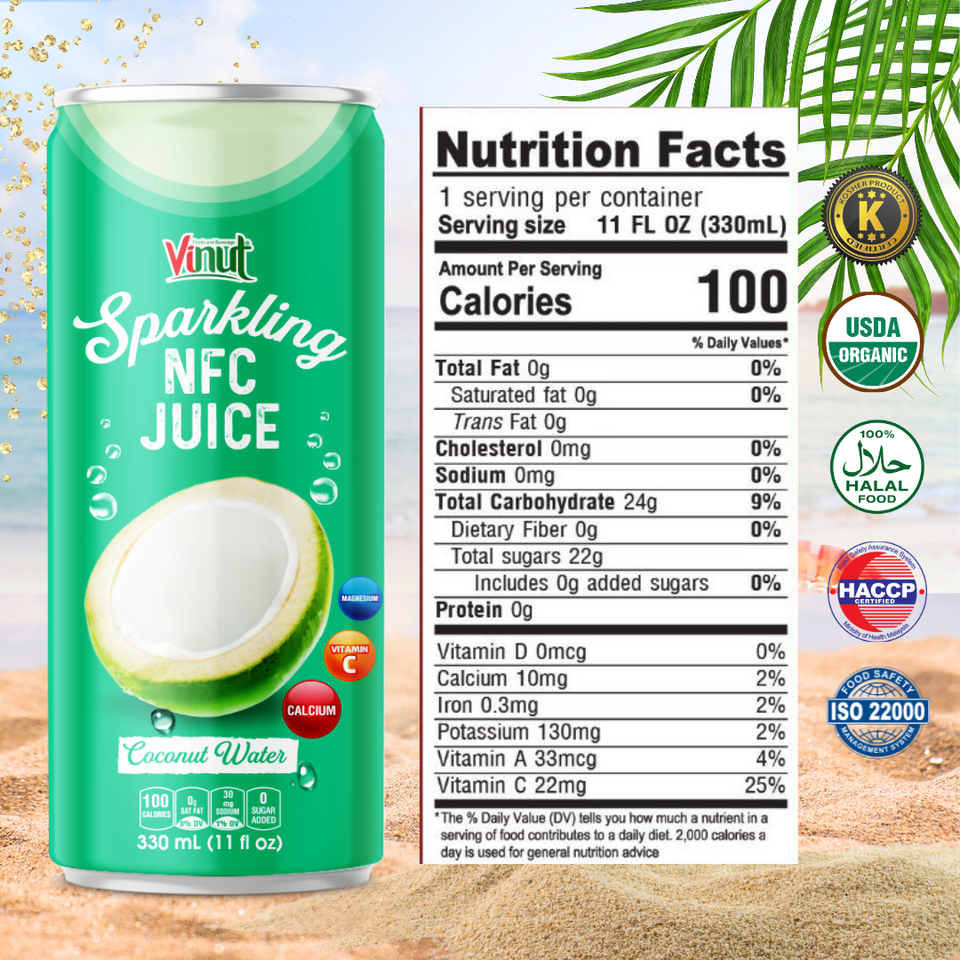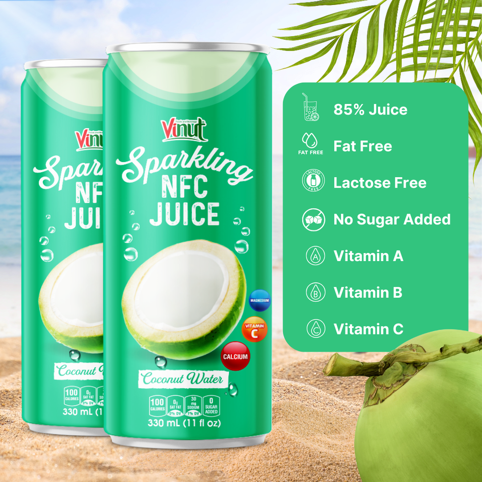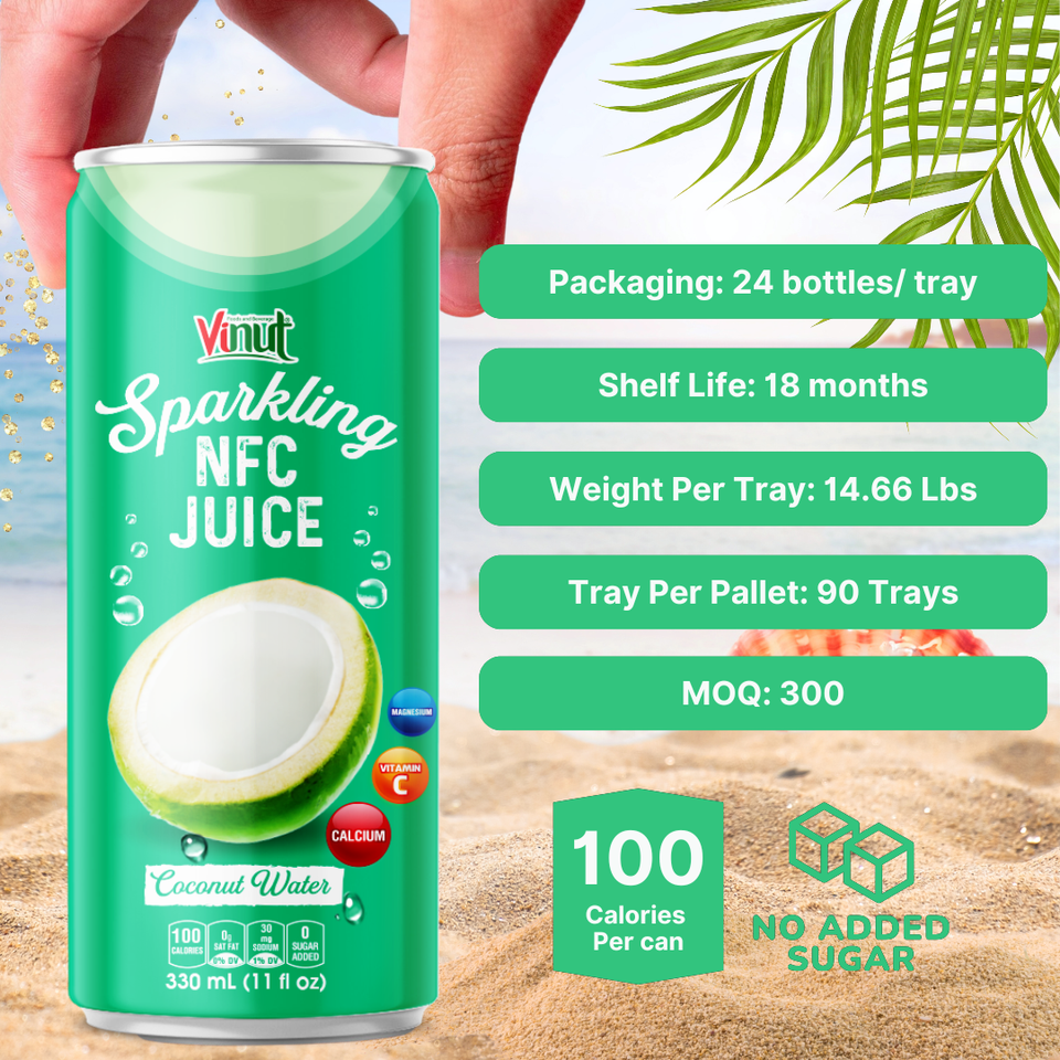 เครื่องดื่มน้ำมะพร้าวประกาย330มล. vinut 24กระป๋องต่อกล่องไม่สามารถเติมน้ำตาลที่ไม่ใช่ GMO OEM ODM ปรับแต่งได้ตัวอย่างฟรี