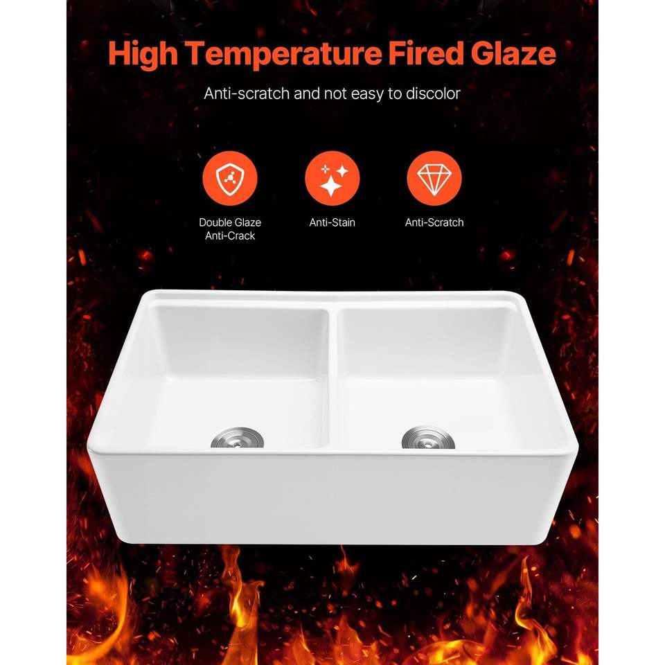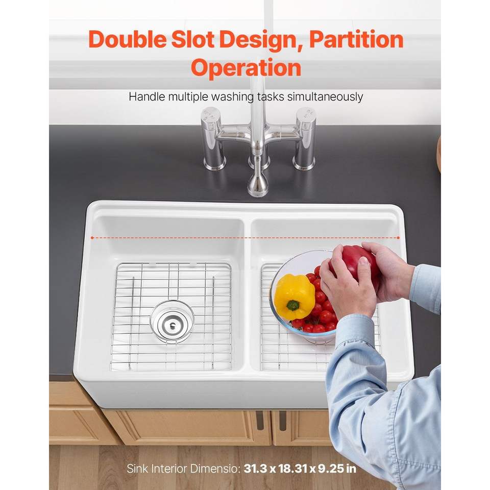 อ่างล้างจานครัวแบบสองหลุม ขนาด 33x20 นิ้ว สีขาว ทำจากดินเผาทนไฟ พร้อมอ่างล้างจานแบบฝังใต้เคาน์เตอร์ ขนาด 33x20 นิ้ว สไตล์ฟาร์มเฮาส์