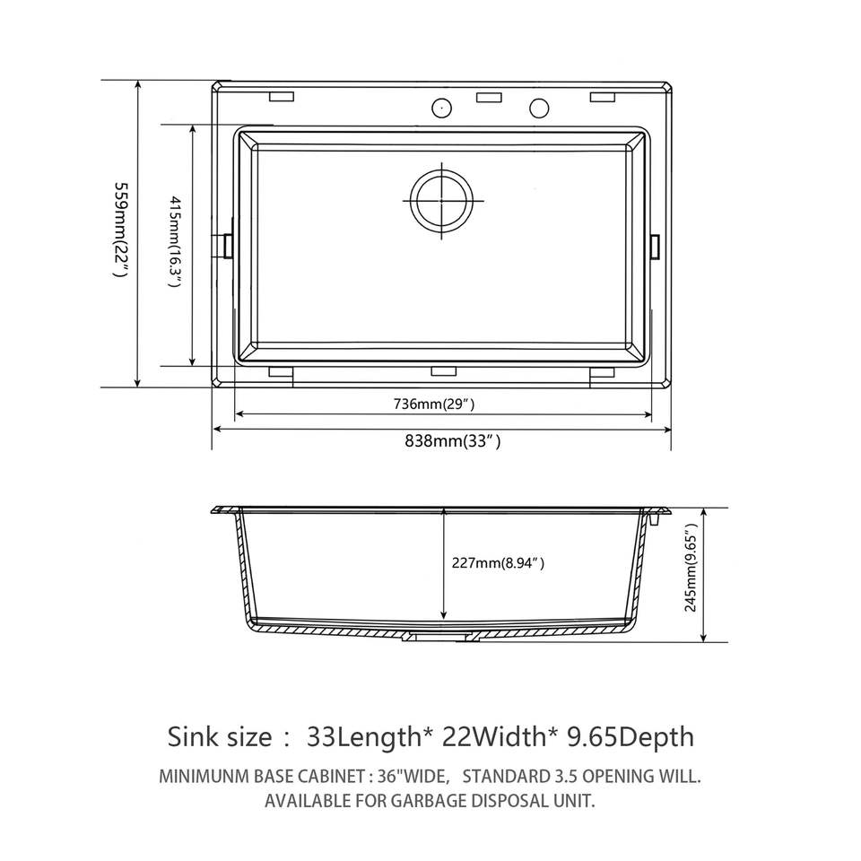 ซิงค์ควอตซ์อ่างล้างจานในห้องครัวทำจากหินแกรนิตสีดำ33X22