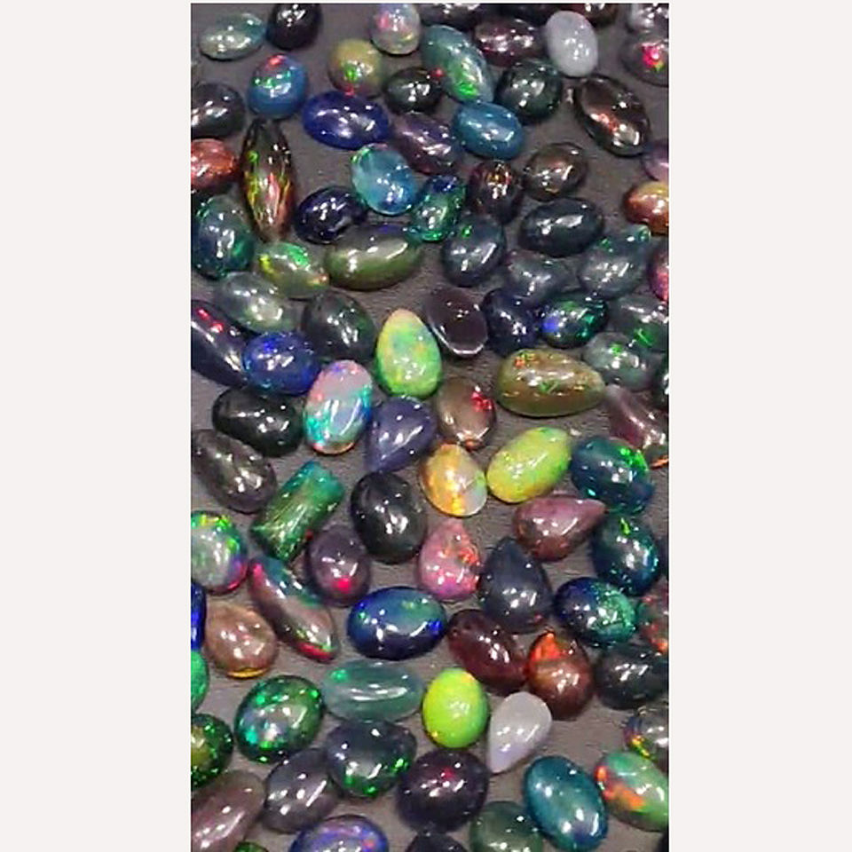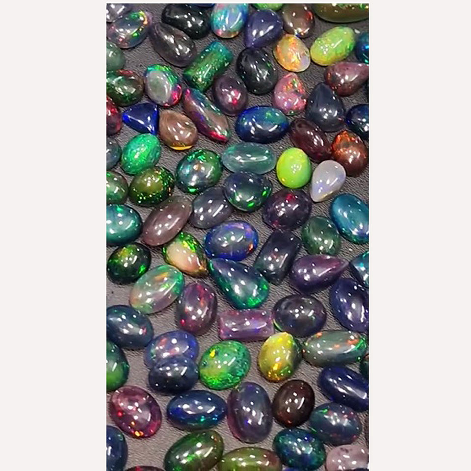 โอปอลดำเอธิโอเปียธรรมชาติ 345 ชิ้น พร้อมประกายไฟ ขนาด 8 มม. ถึง 16 มม. รูปทรงวงรี ลูกแพร์ แปดเหลี่ยม คาโบชอง น้ำหนัก 405 กะรัต ขายโดย Iroc Sales Gemstone cab ราคา 260 ดอลลาร์สหรัฐ