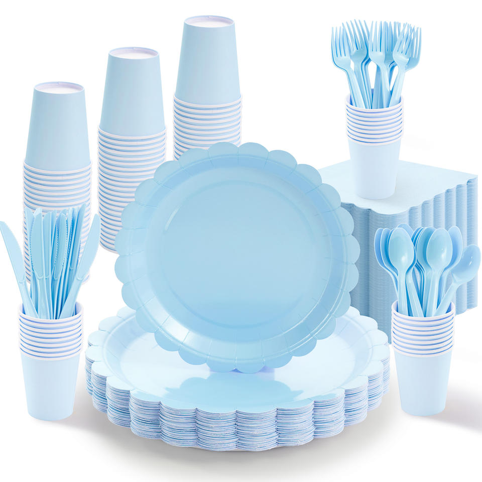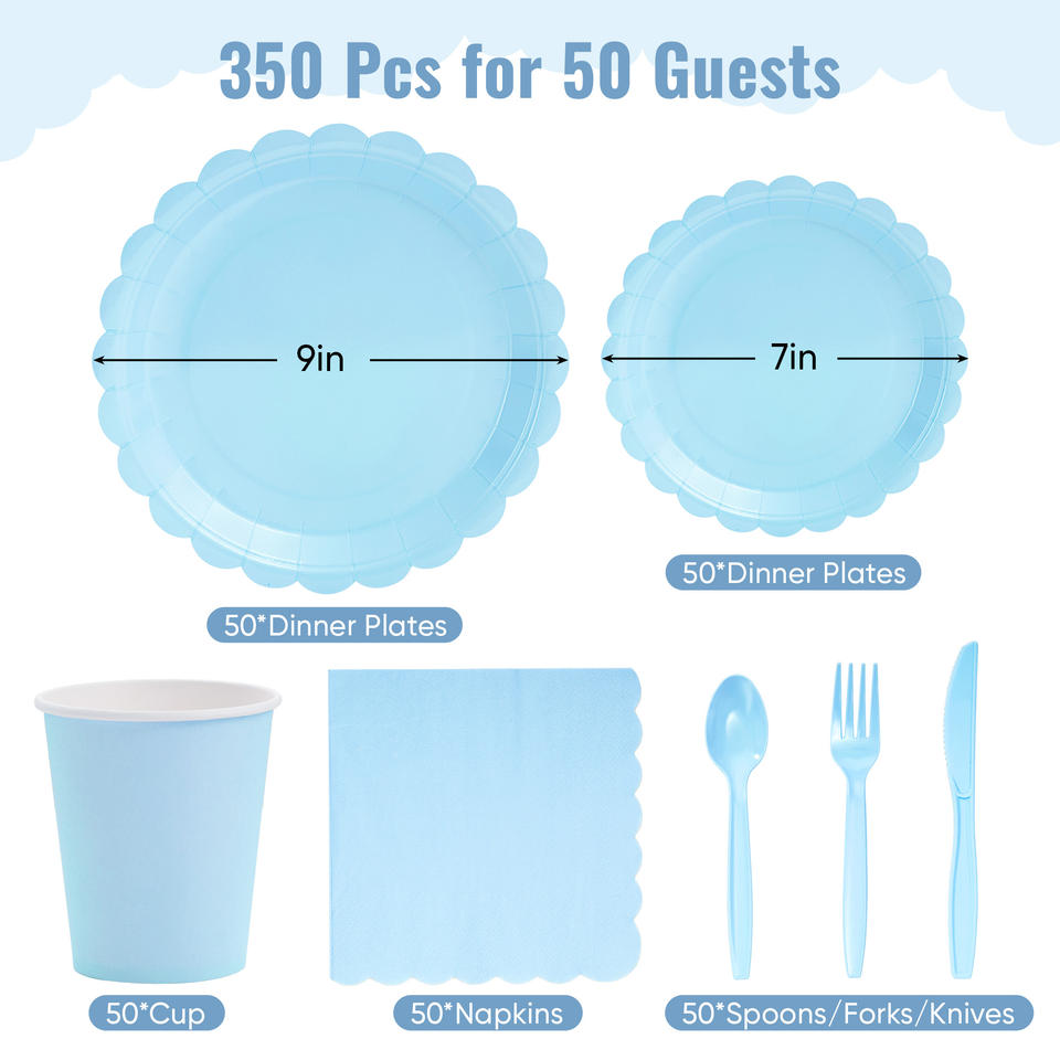 ชุดภาชนะใส่อาหารแบบใช้แล้วทิ้ง PET สีฟ้าอ่อน 350 ชิ้น สำหรับแขก 50 คน ประกอบด้วยจาน แก้ว ผ้าเช็ดปาก เป็นมิตรกับสิ่งแวดล้อม เหมาะสำหรับงานเลี้ยงฉลองเด็กอ่อน