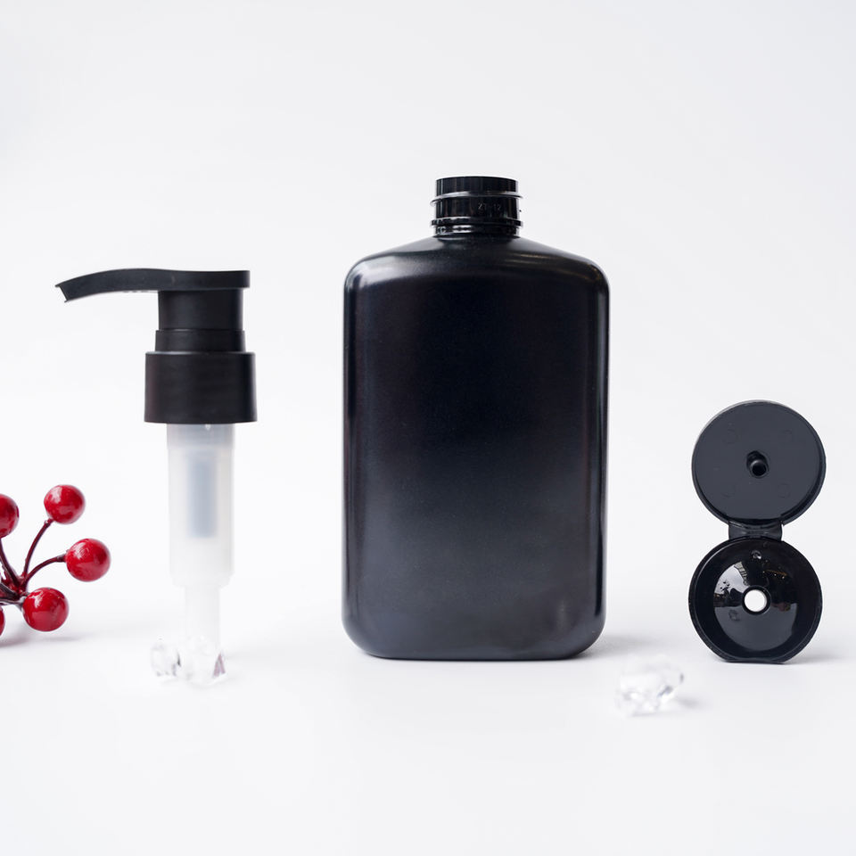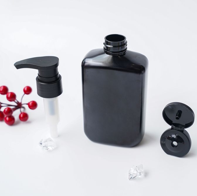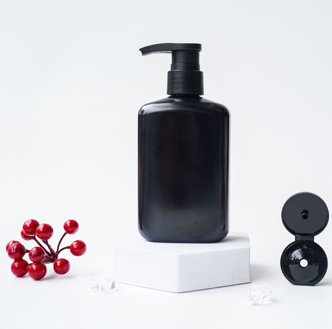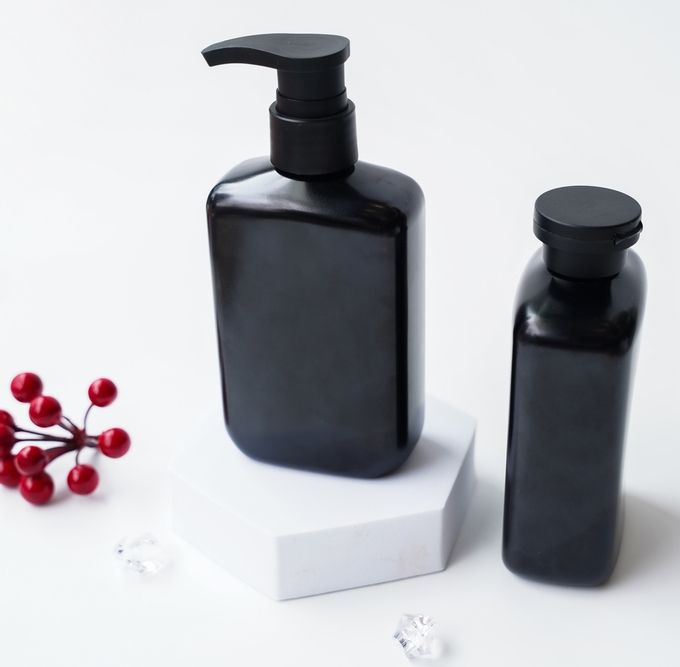 ขวดพลาสติกสีดำสำหรับอาบน้ำสัตว์เลี้ยงขนาด350มล. ขวดน้ำล้างร่างกายทำจากพลาสติกสีดำทรงสี่เหลี่ยมแบนใช้ซ้ำได้