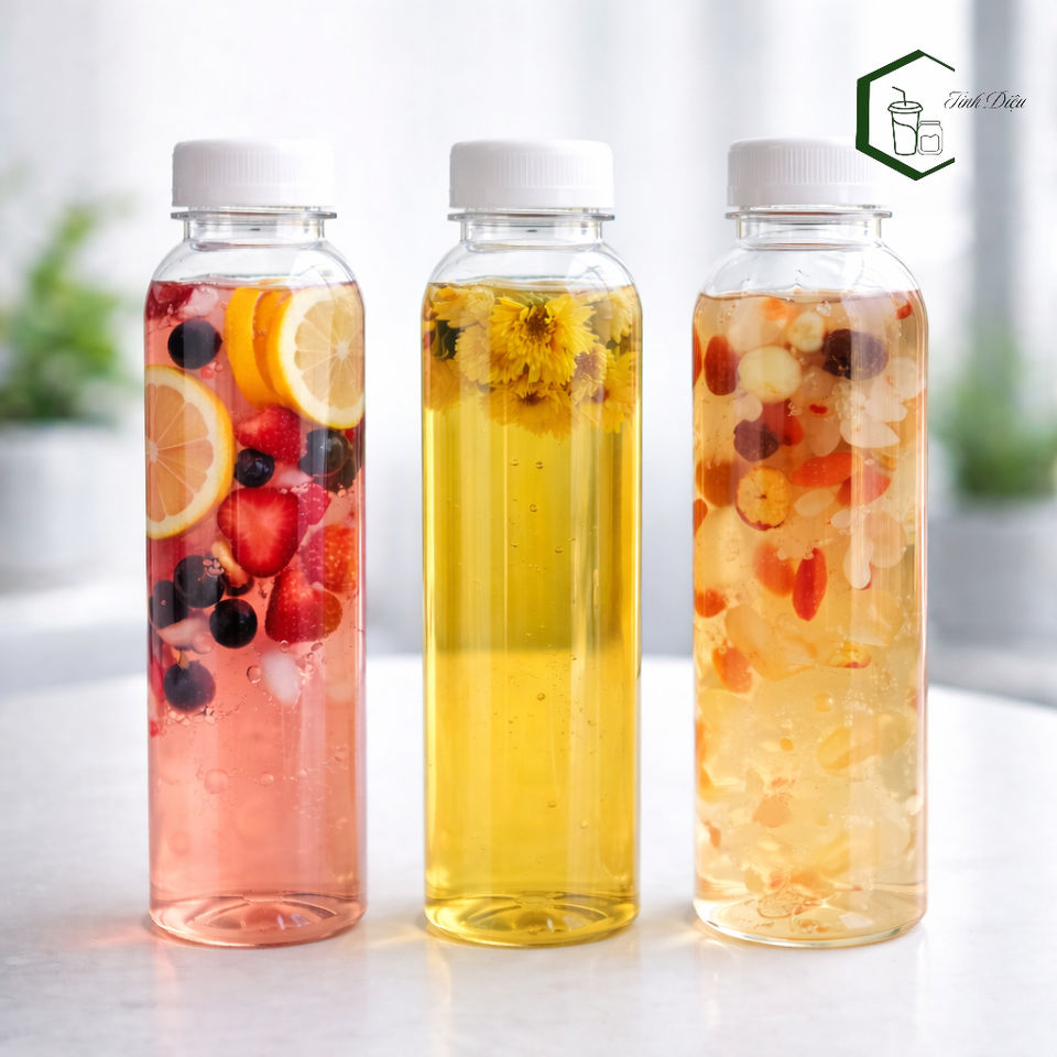 ขวดพลาสติก PET ทรงกลมขนาด 350 มล. พร้อมฝาเกลียวขนาด 38 มม. สำหรับน้ำผลไม้ สมูทตี้ เครื่องดื่มดีท็อกซ์ โรงงาน OEM เวียดนาม บรรจุภัณฑ์เรียบหรู