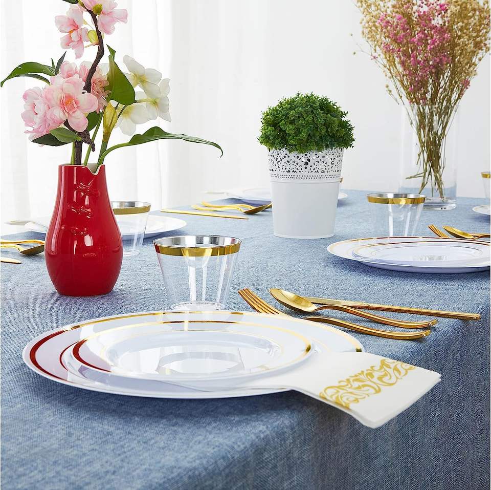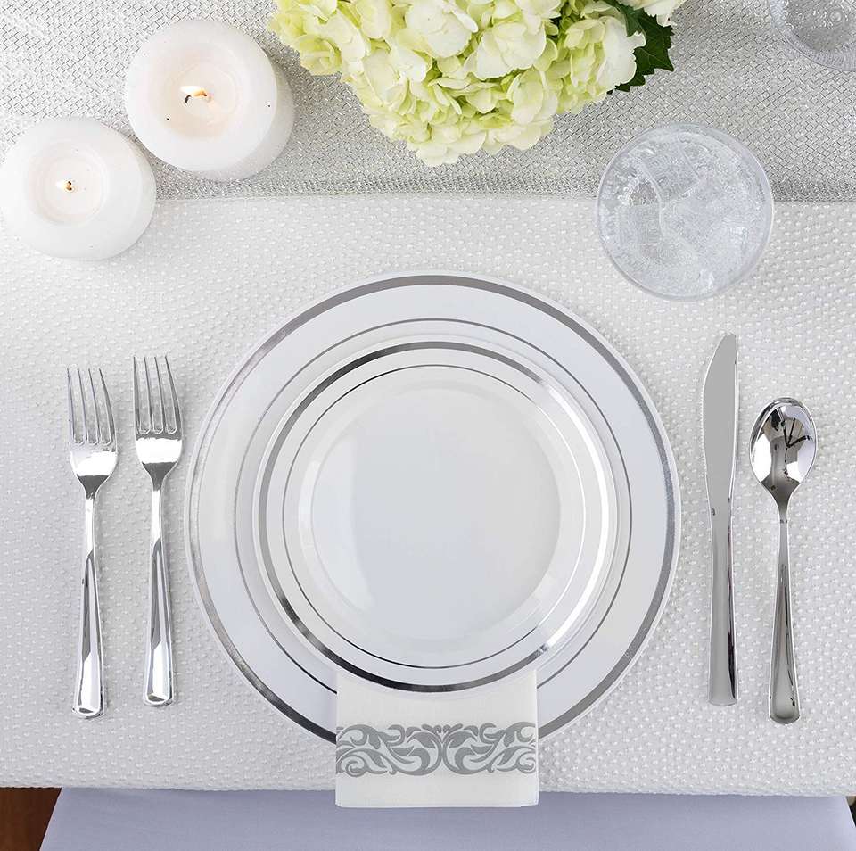 ชุดอาหารเย็นพลาสติก350ชิ้น-แขก50คน-จานอาหาร50ชิ้น-เครื่องเงินพลาสติก20ชิ้น-ถ้วยพลาสติก50ชิ้น-ผ้าเช็ดปาก50ชิ้น