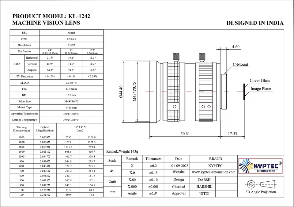 เลนส์วิชันซิสเต็ม 35 มม. 25MP ขนาด 1.1 นิ้ว เลนส์กล้องอุตสาหกรรมแบบโฟกัสคงที่ ภาพความละเอียดสูง