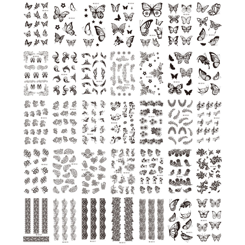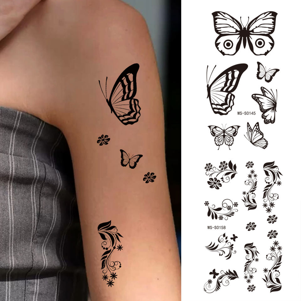 สติกเกอร์รอยสักรูปผีเสื้อดอกไม้สีดำกันน้ำ35ชิ้น/เซ็ตสติกเกอร์รอยสักรูปใบไม้ปลอมที่แขนตัวอักษรสติกเกอร์สักแฟชั่นชั่วคราว