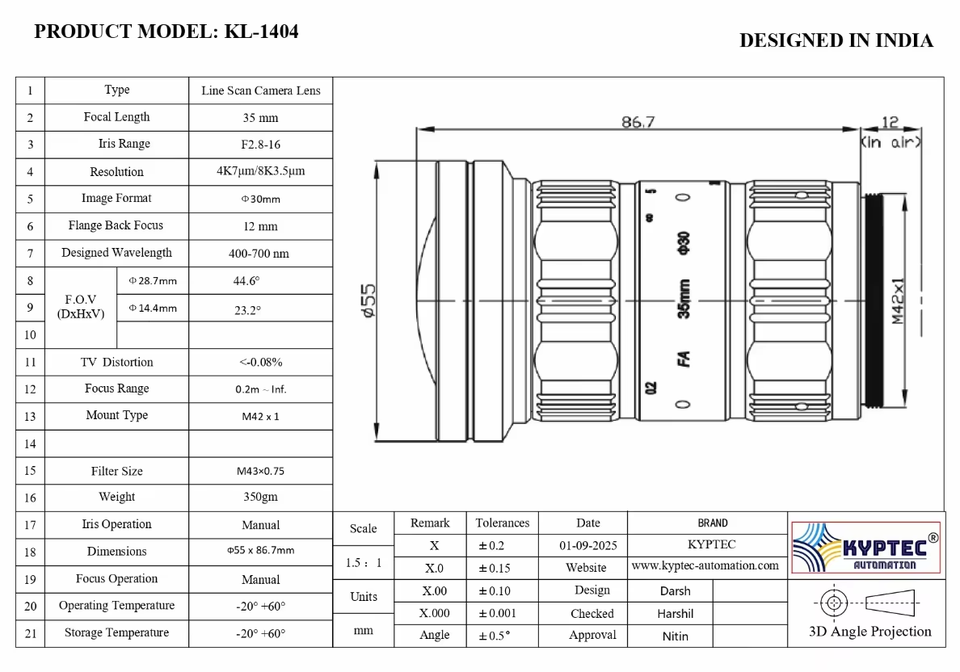 เลนส์ถ่ายภาพแบบไลน์สแกนขนาด 35 มม. สำหรับกล้อง 8K และ 4K ระบบการมองเห็นทางอุตสาหกรรมและระบบตรวจสอบคุณภาพ