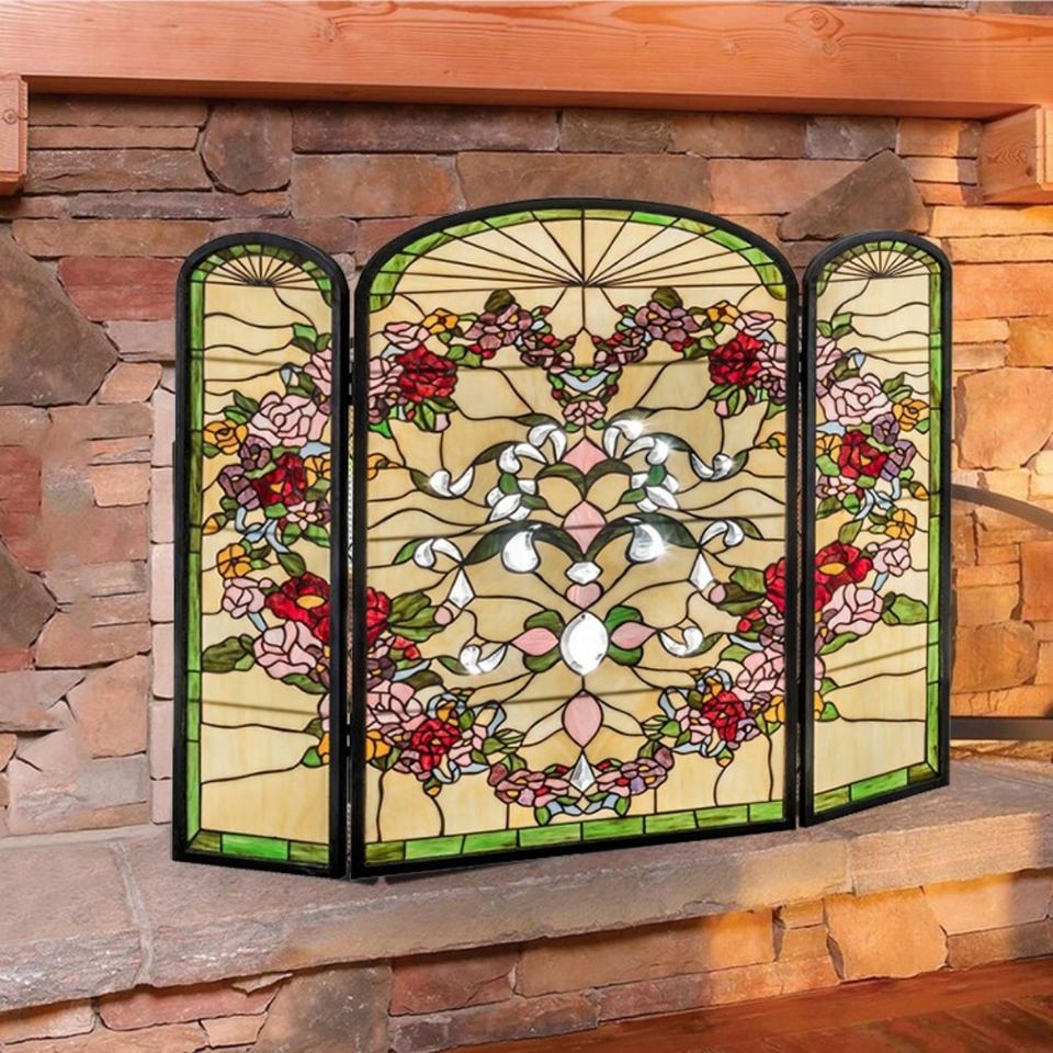 ฉากกั้นเตาผิงกระจกสีลายดอกไม้สไตล์ยุโรปทำมือ ขนาด 36''*28'' สำหรับห้องรับประทานอาหารและห้องนอน