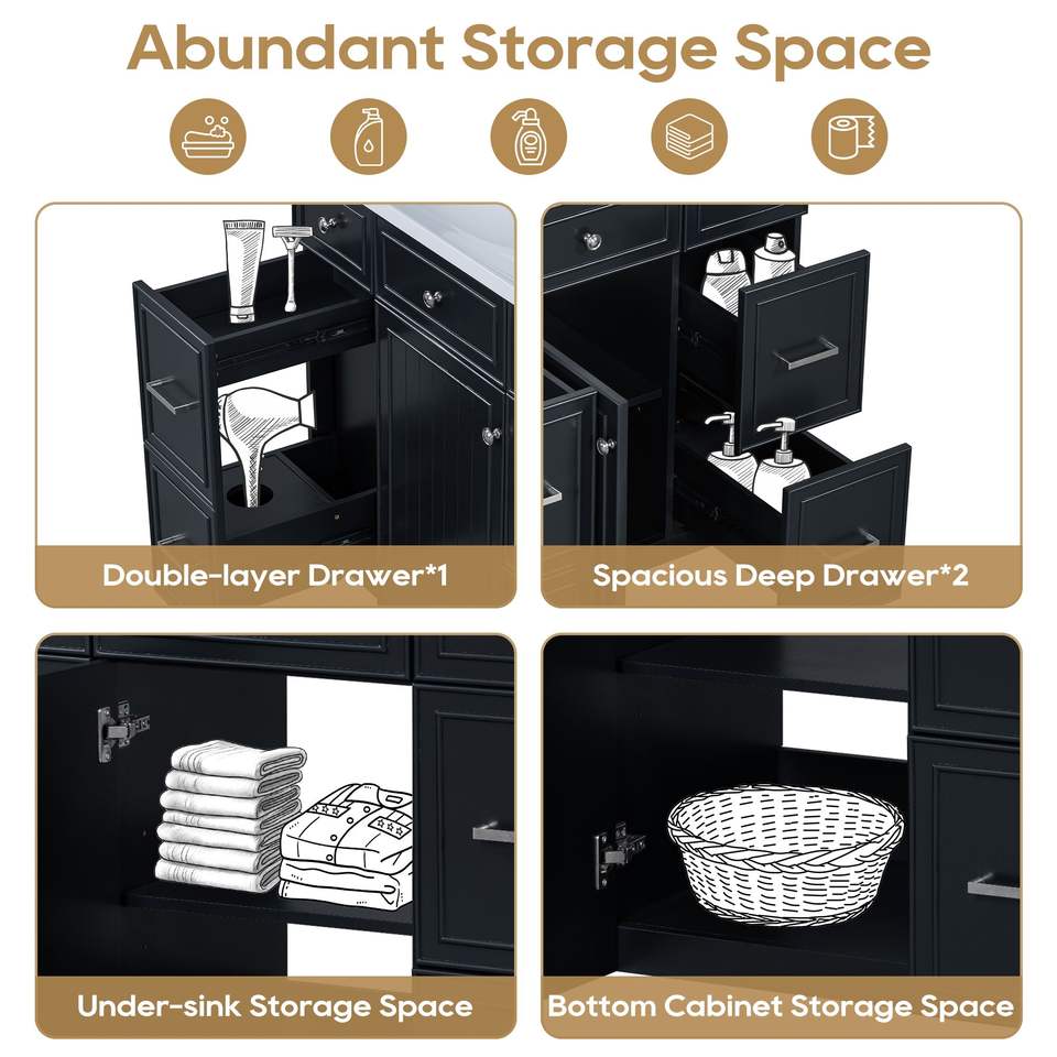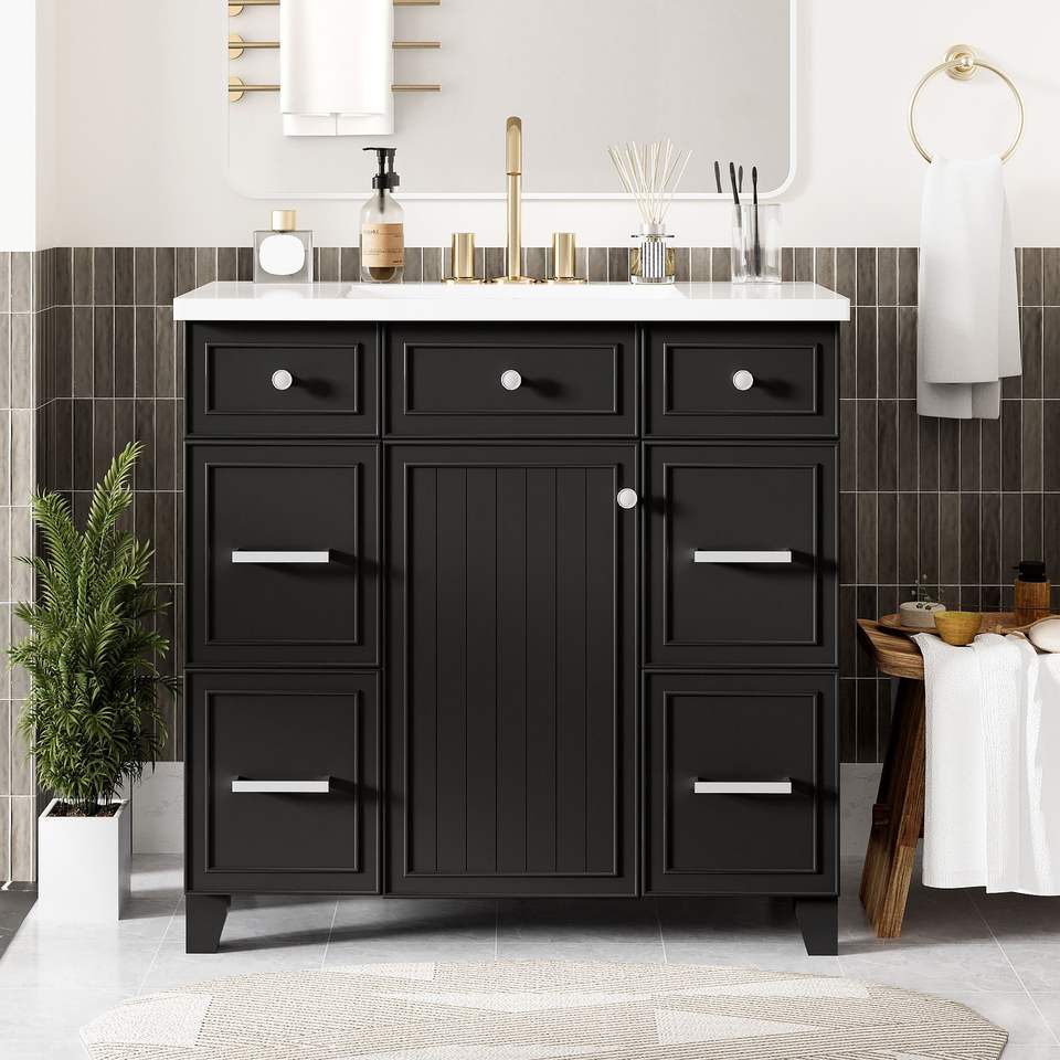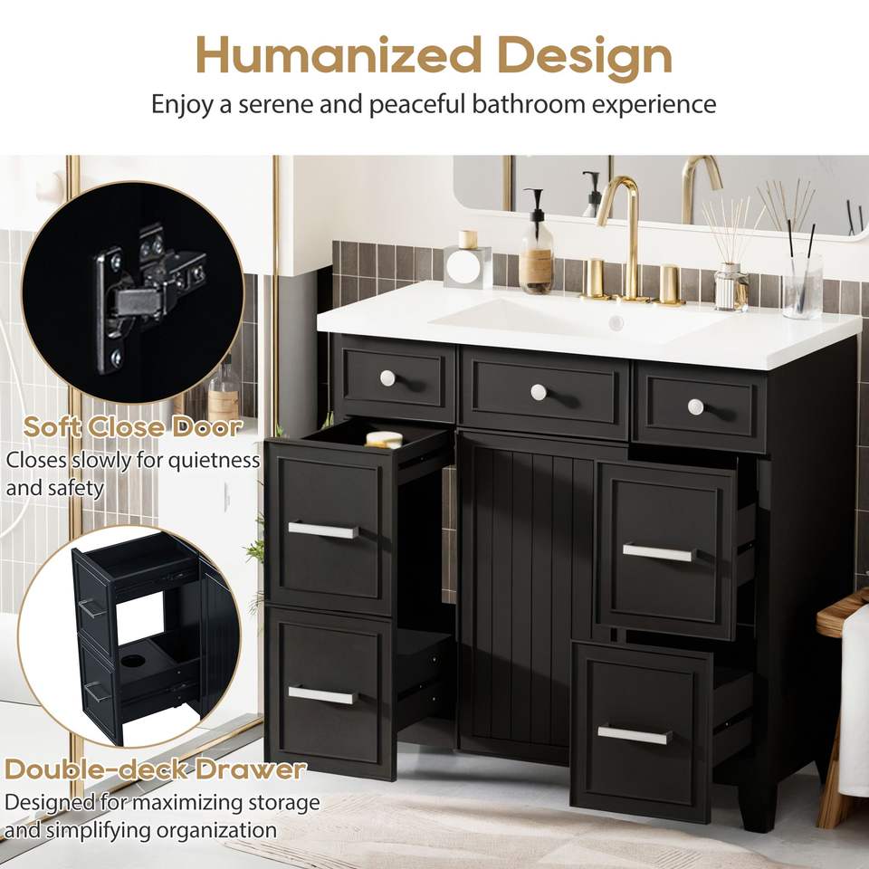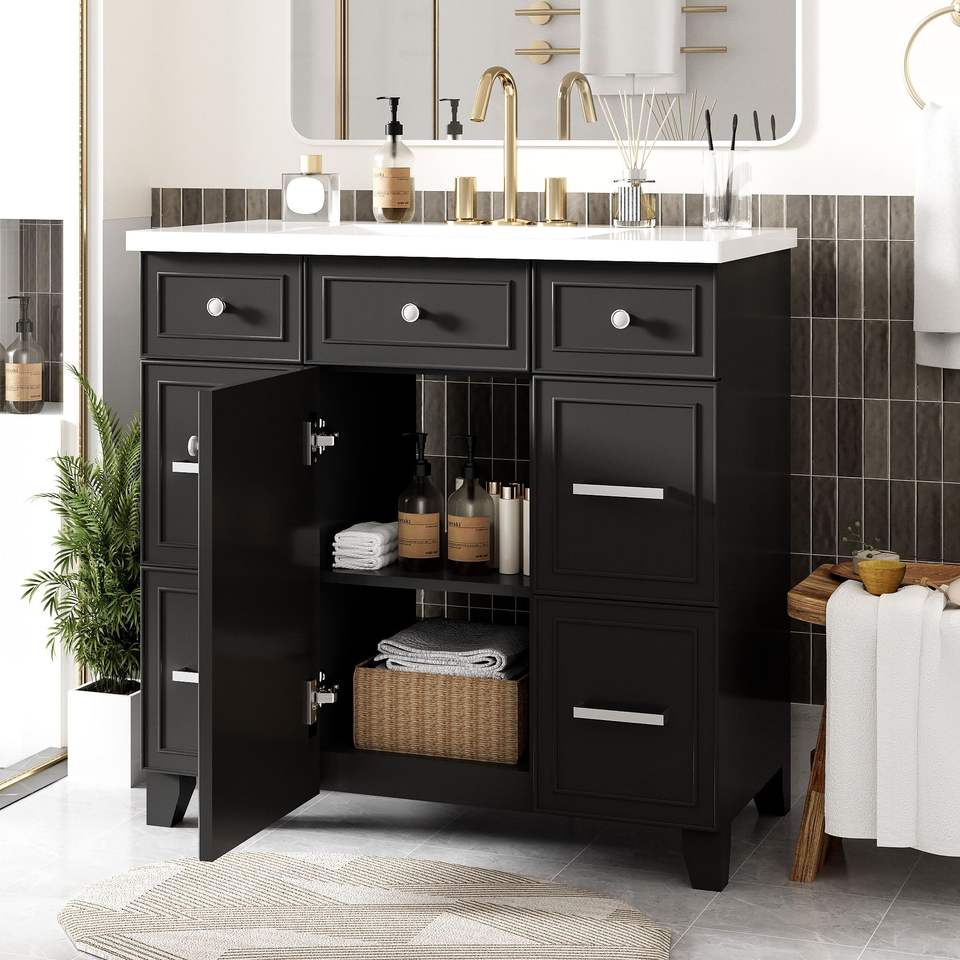 ตู้ห้องน้ำแบบเชคเกอร์ขนาด 36 นิ้ว พร้อมอ่างล้างหน้าเดี่ยว ชุดตู้พร้อมบานประตูและลิ้นชักแบบปิดนุ่มนวล