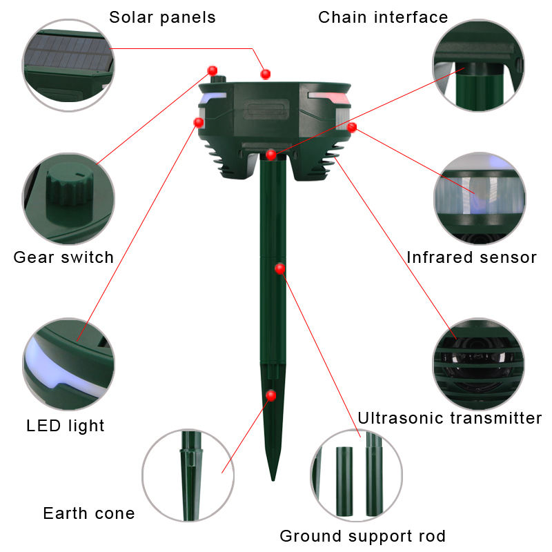 เครื่องไล่นกและหนูแบบชาร์จไฟได้ 360 องศา ผลิตจากวัสดุ ABS แข็งแรง ทนทาน กันน้ำ ดีไซน์เป็นมิตรกับสิ่งแวดล้อม สำหรับใช้ในบ้านและสวน ครอบคลุมพื้นที่ 150-200 ตารางเมตร
