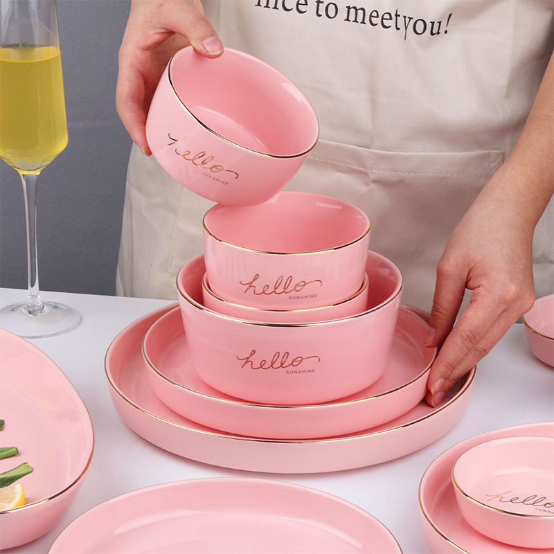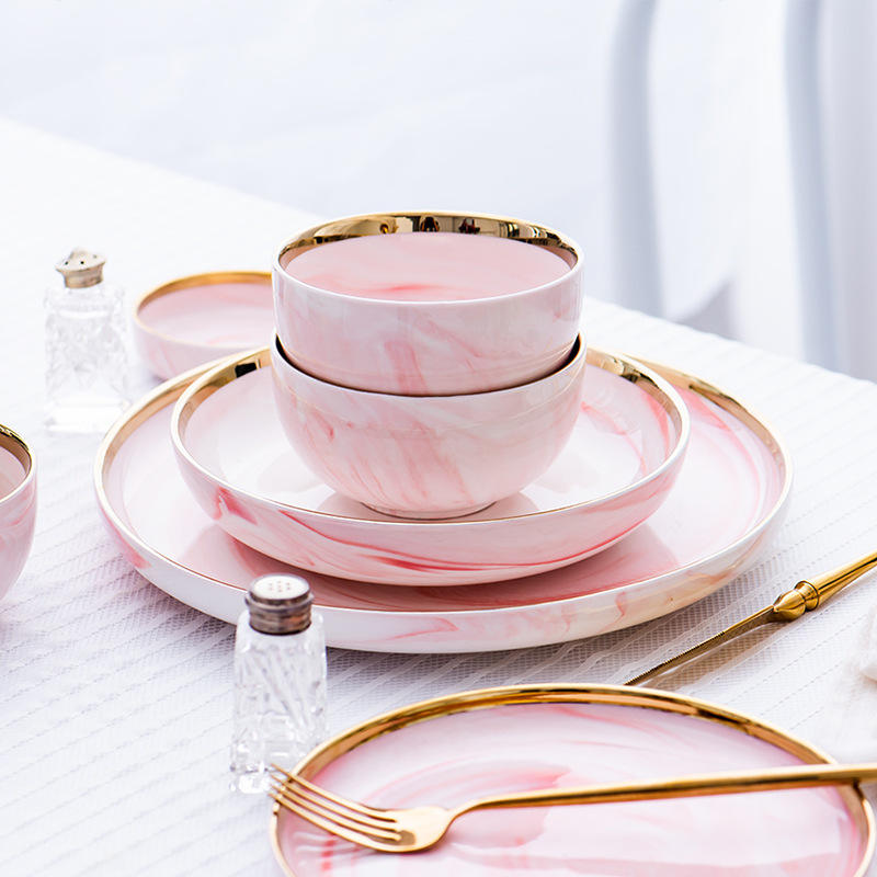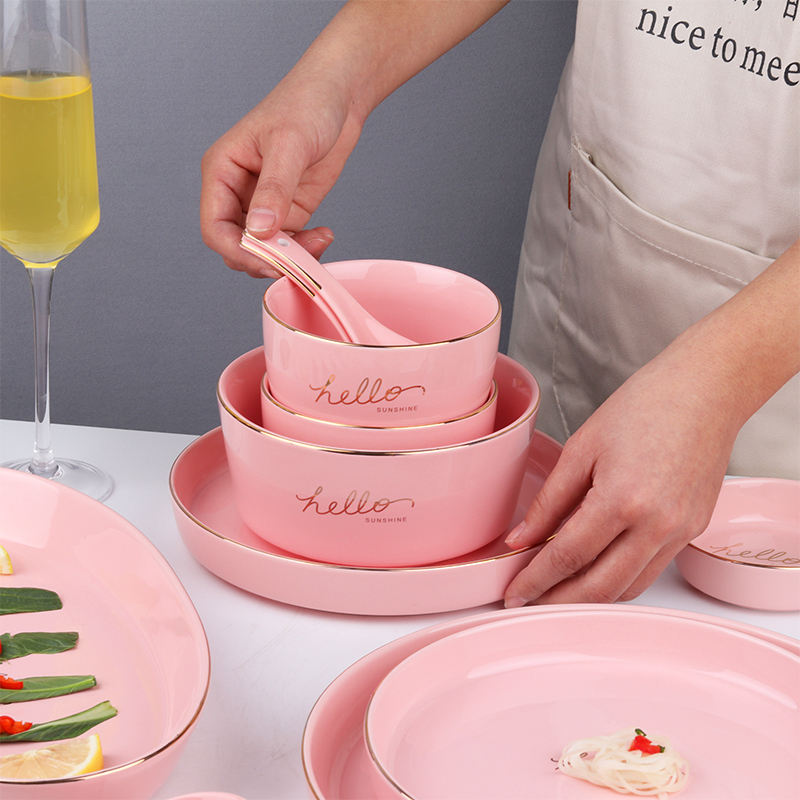 ชื่อผลิตภัณฑ์:ชุดจานและชามอาหารค่ำสีชมพูลายครามขอบทองสีชมพู