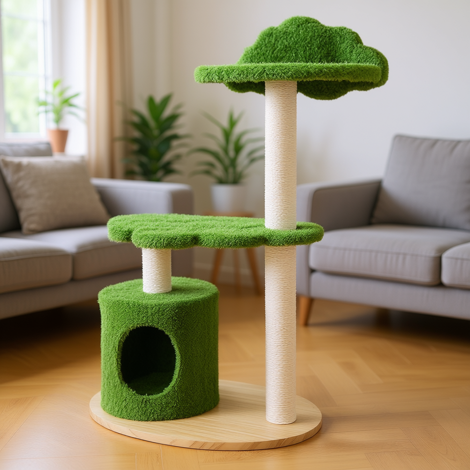 ต้นไม้แมวสีเขียวขนาด 38 นิ้ว เสาข่วนทำจากใยไซซอล เป็นมิตรกับสิ่งแวดล้อม เฟอร์นิเจอร์แมวในบ้าน ดีไซน์การ์ตูนน่ารัก สองชั้น สำหรับแมว