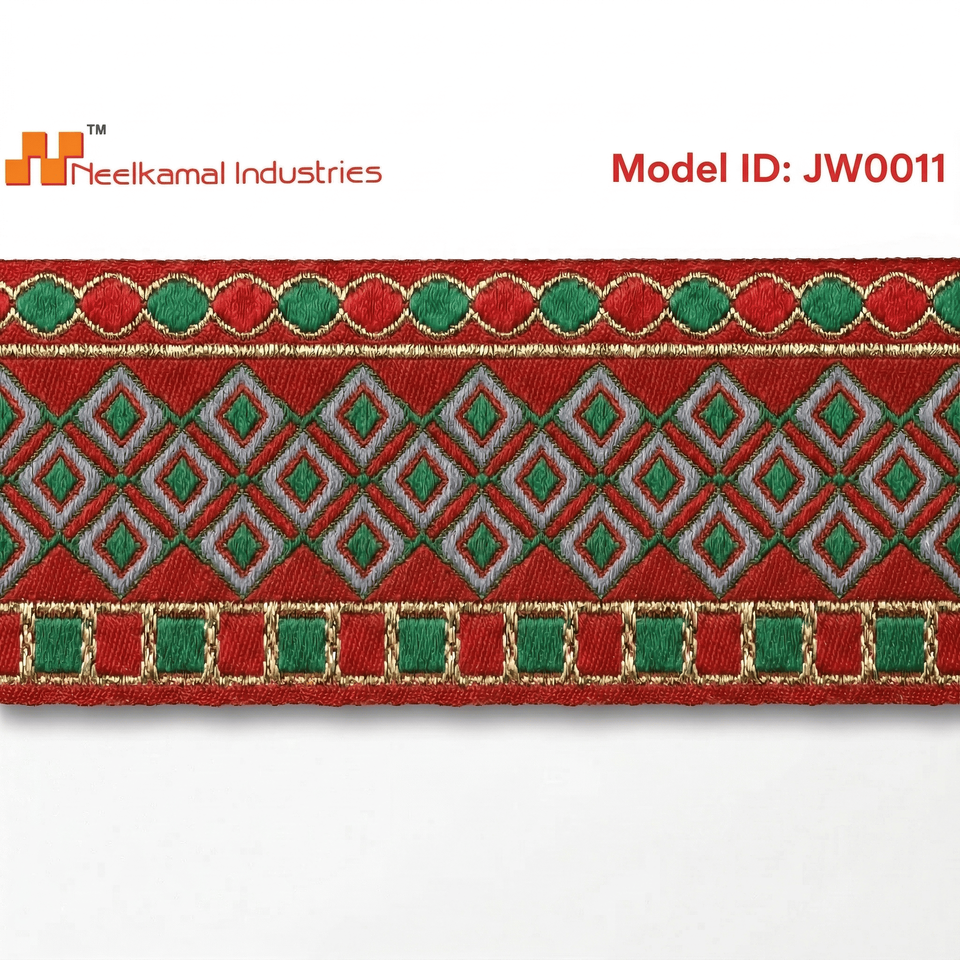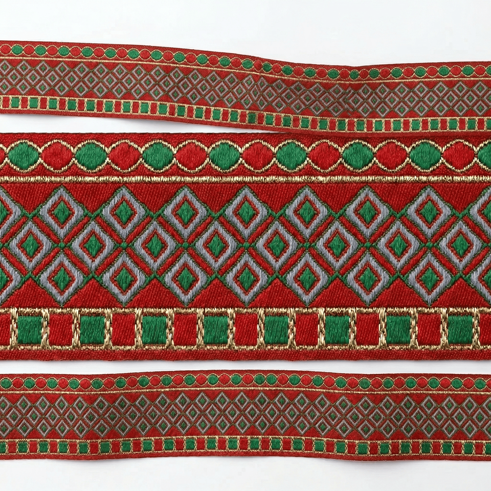 ริบบิ้นลายแจ็คการ์ดขนาด 38 มม. ผ้าโพลีเอสเตอร์ 100% ลายทองแดง แดง เขียว ลายเรขาคณิต สำหรับตกแต่งขอบผ้าส่าหรี ผ้าลูกไม้ โบว์ ชุดงานเทศกาล