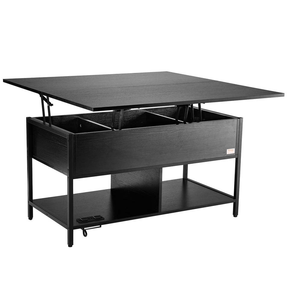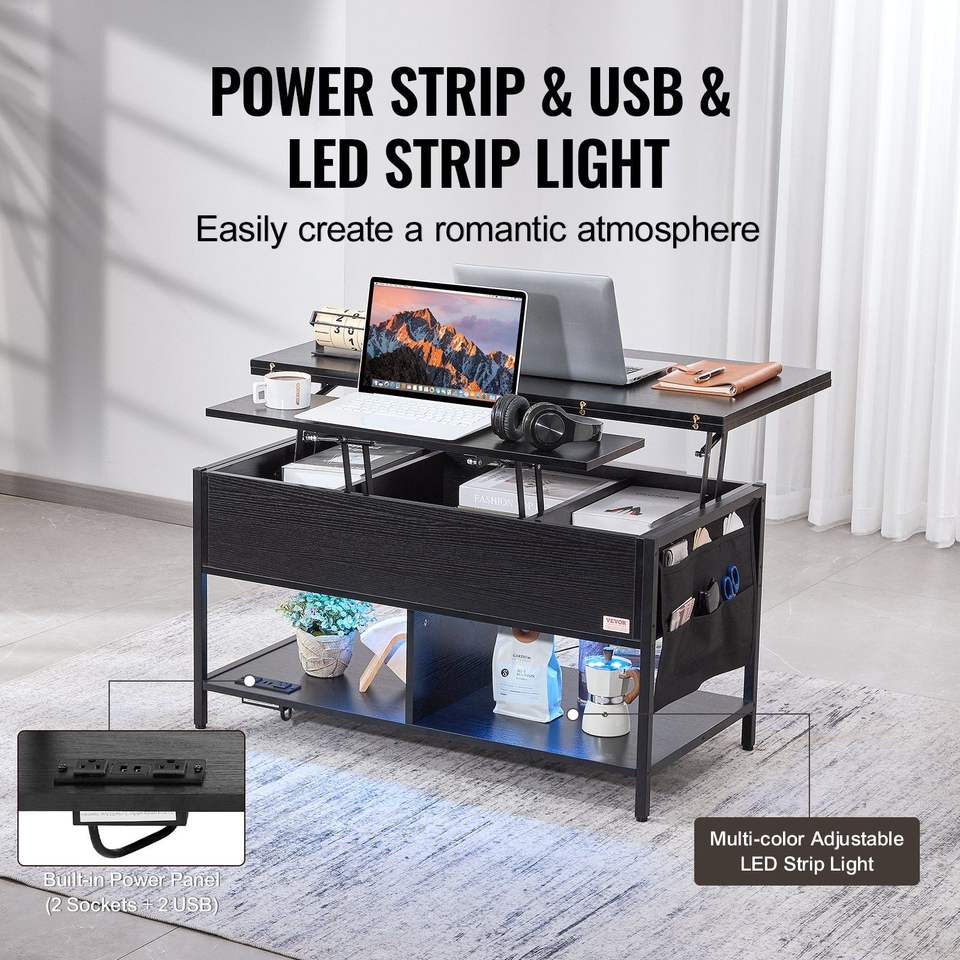 โต๊ะกาแฟทรงสี่เหลี่ยมผืนผ้าขนาด 39.4 นิ้ว พร้อมช่องเก็บของเพิ่มเติมและปลั๊กไฟแบบพลิกได้ ใช้ได้กับปลั๊กไฟแบบ US