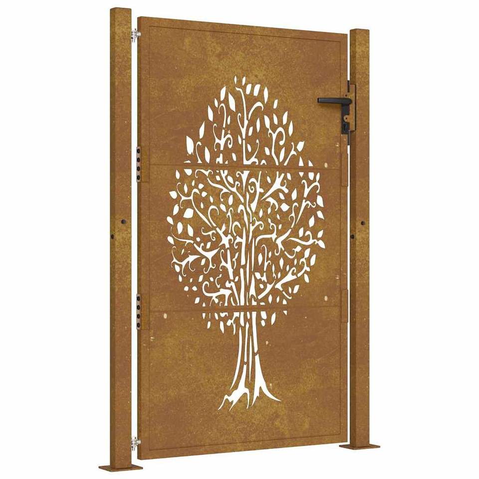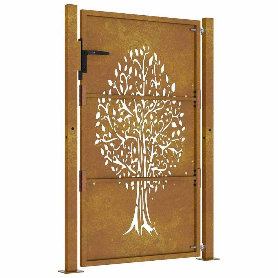ประตูสวนขนาด 39.4x49.2 นิ้ว พร้อมดีไซน์ลายต้นไม้ รั้วเหล็กคอร์เทน ทรีลลิส และประตู