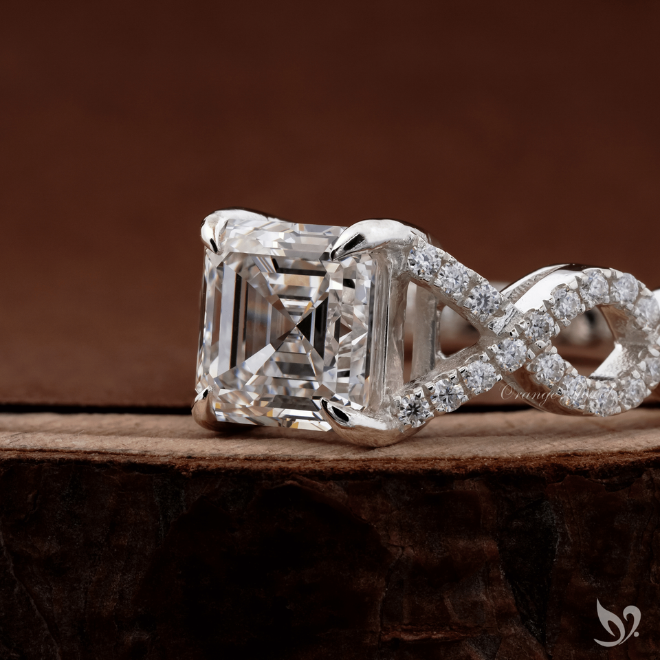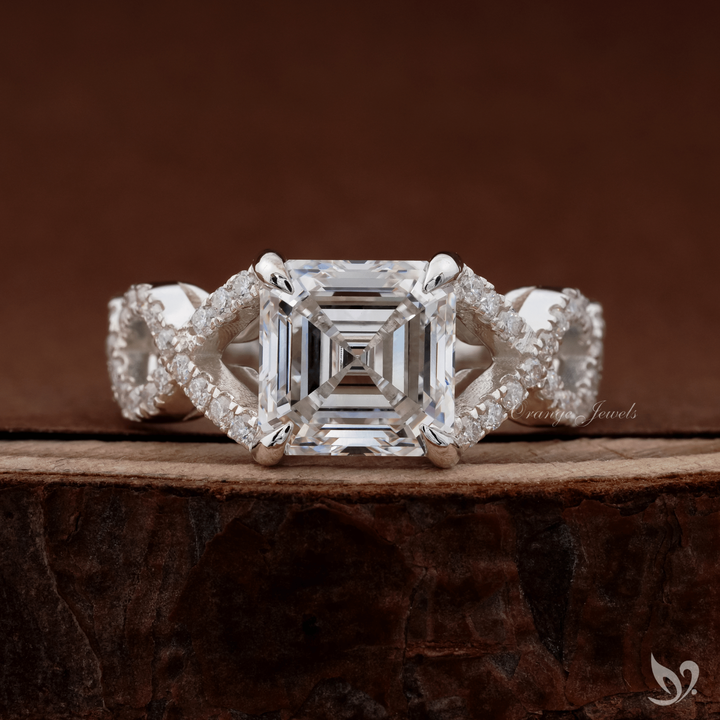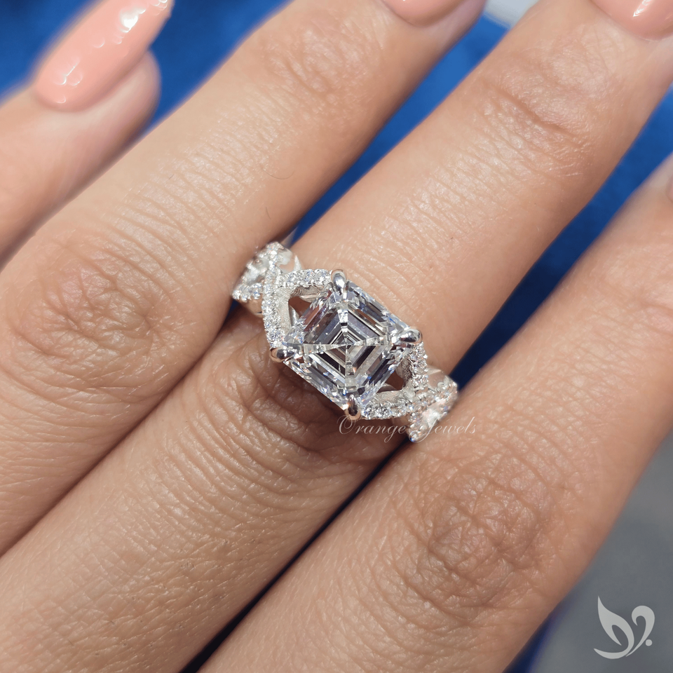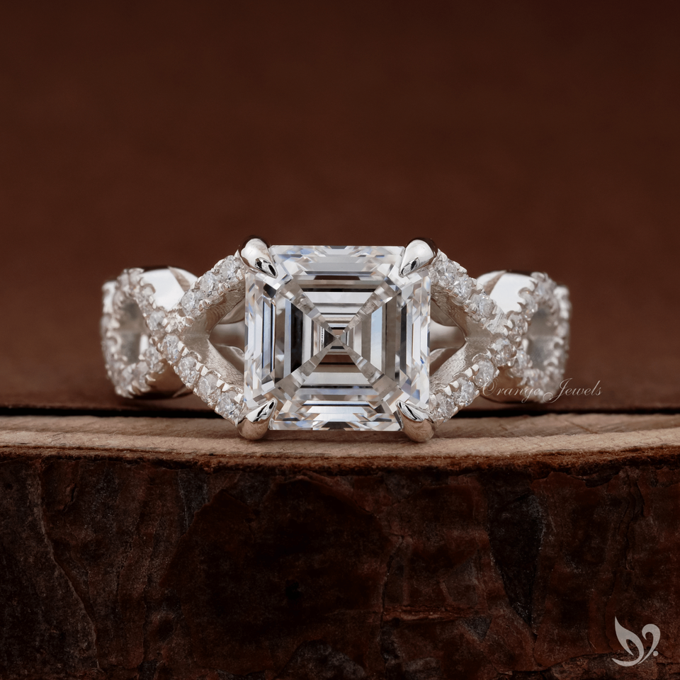 แหวนเพชรทรง Asscher 3 กะรัต รับรองโดย IGI ดีไซน์วงแหวนแบบเกลียวประดับเพชรแบบ Pave ตัวเรือนทองคำขาว 10K