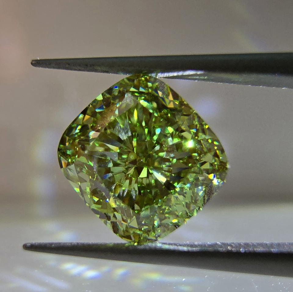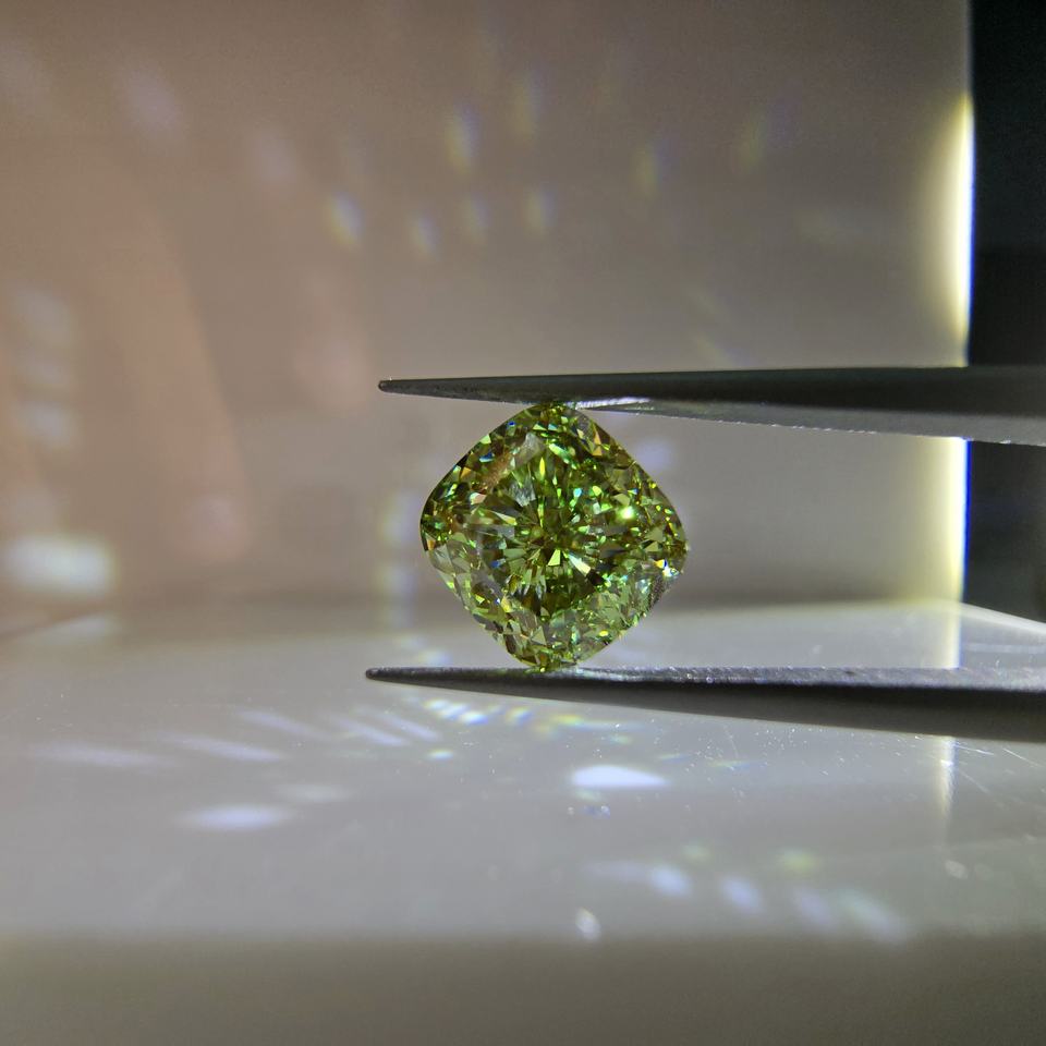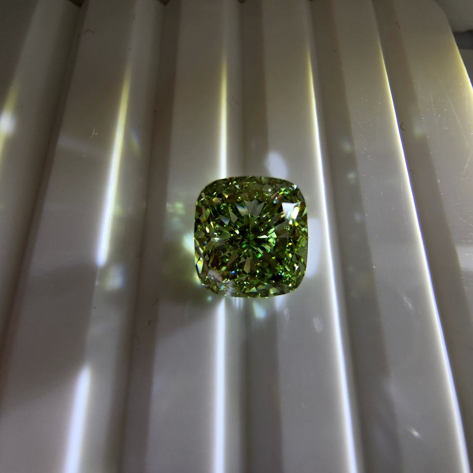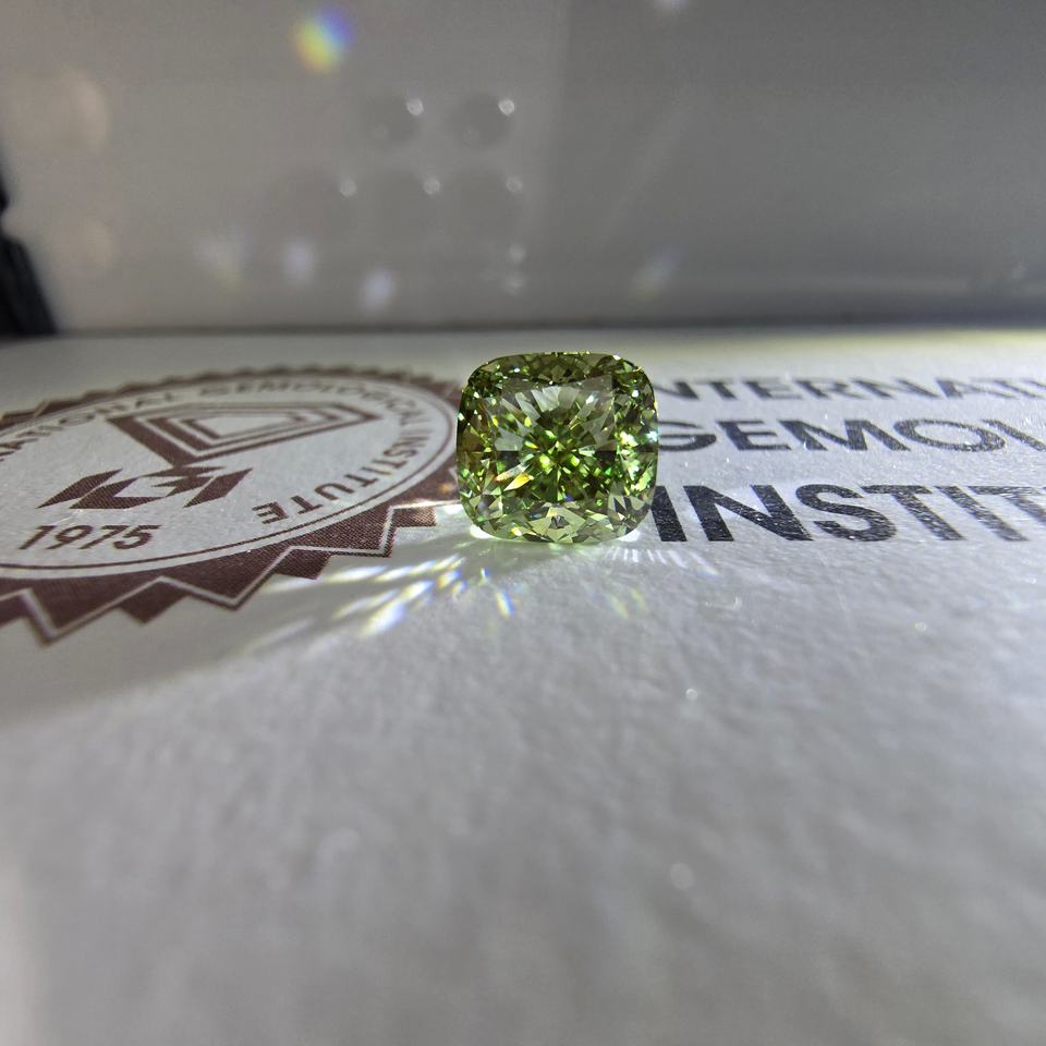 เพชรทรงสี่เหลี่ยม 3 กะรัต แบบคุชชั่น ปรับแต่งสีเขียวสดใส VS1 เพชรเพาะเลี้ยงในห้องปฏิบัติการ รับรองโดย IGI เพชรเม็ดเดี่ยว