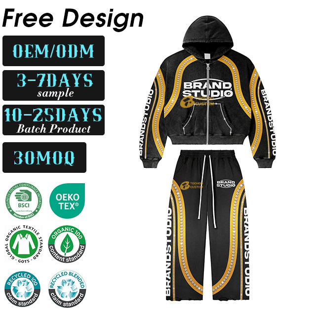 3D Acid Washed Breathable Sweat Suits Zipper Hood Jacket Flared Sweatpants Custom Digital high quality sweatpants and hoodie set