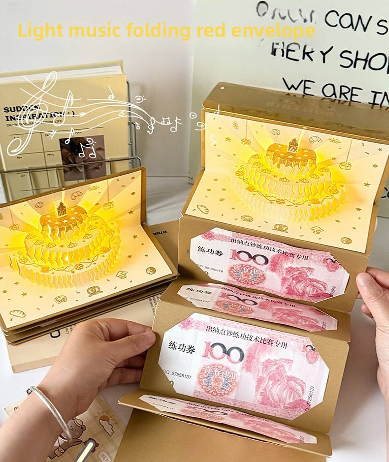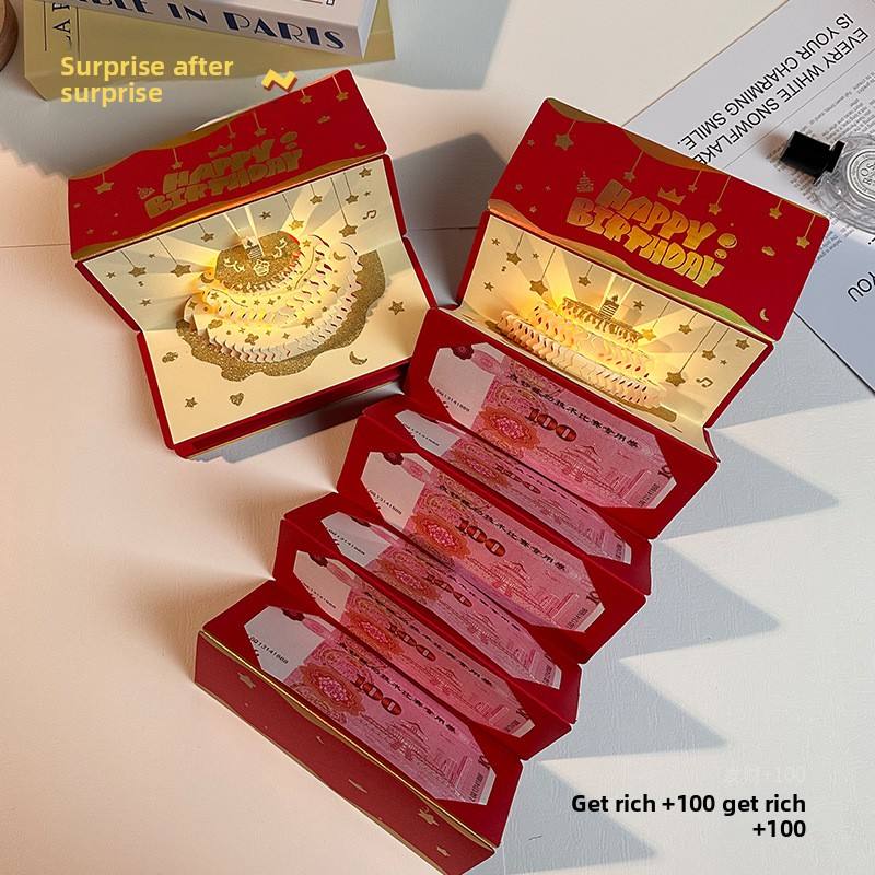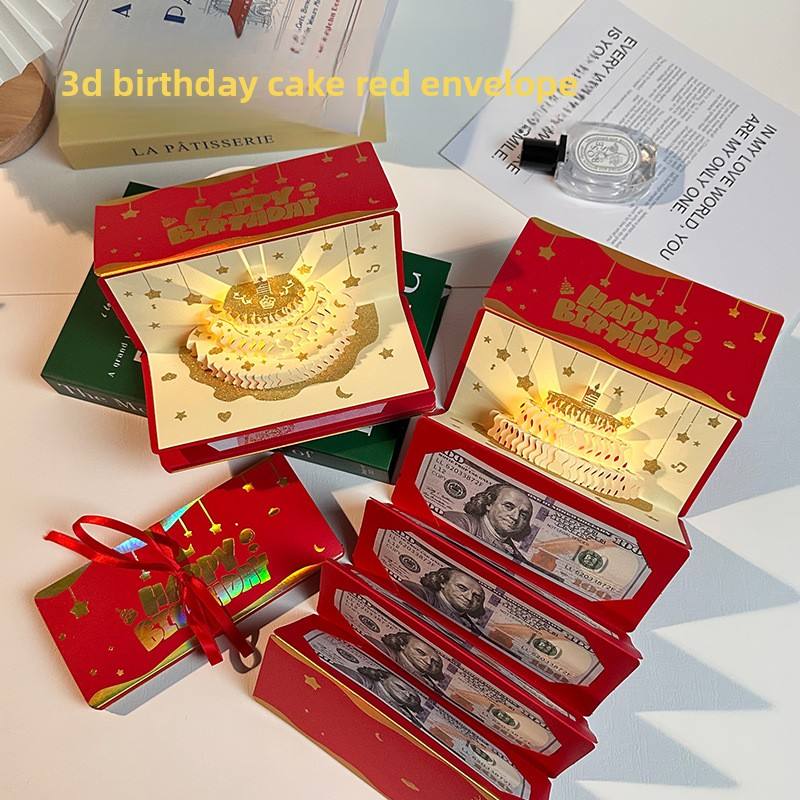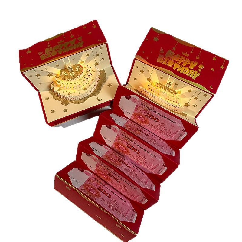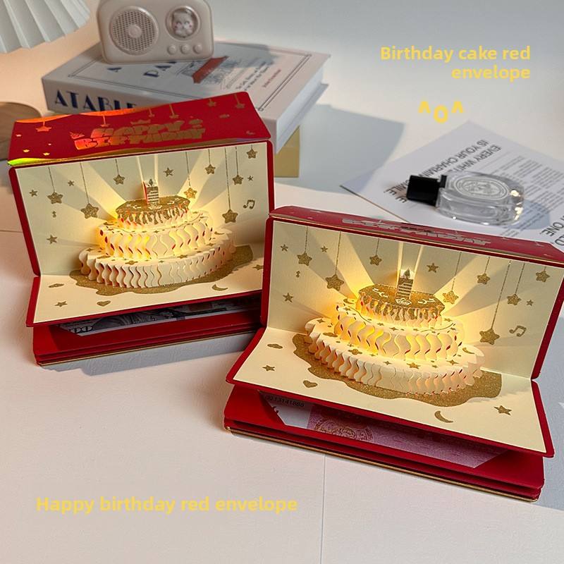 การ์ดอวยพรวันเกิดเค้ก 3 มิติ ซองแดง มีเสียงเพลง มีไฟ ซองอวยพรสร้างสรรค์สำหรับเด็ก ปีใหม่ ซองใส่เงินนำโชค 100 หยวน รูปทรงสี่เหลี่ยมผืนผ้า