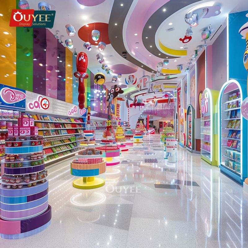 ชั้นวางของดีไซน์3D สำหรับวางลูกกวาดและขนมขบเคี้ยวทำจากไม้เฟอร์นิเจอร์ในร้านลูกกวาด
