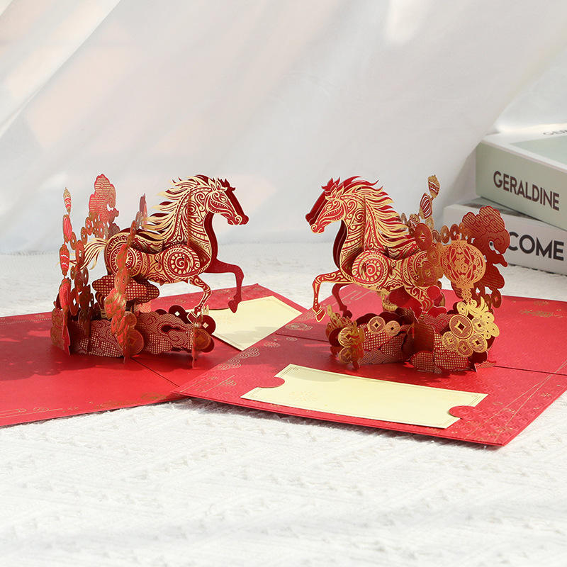 การ์ดอวยพรครบรอบปี 2026 รูปม้าสีแดง งานฝีมือ 3 มิติ สไตล์โมเดิร์น ทำจากกระดาษเคลือบเงา