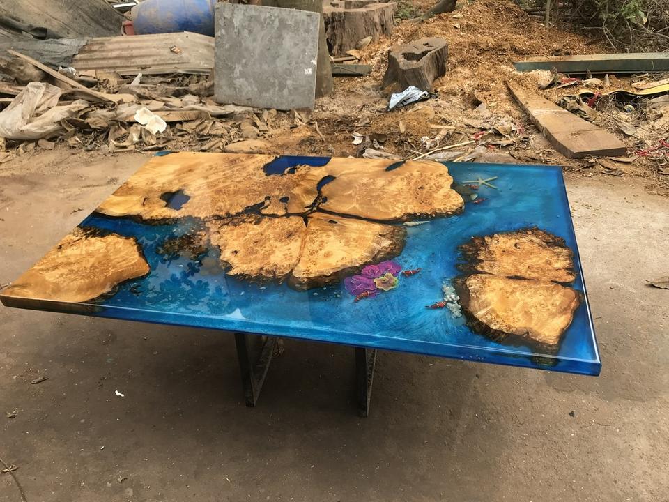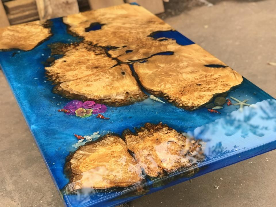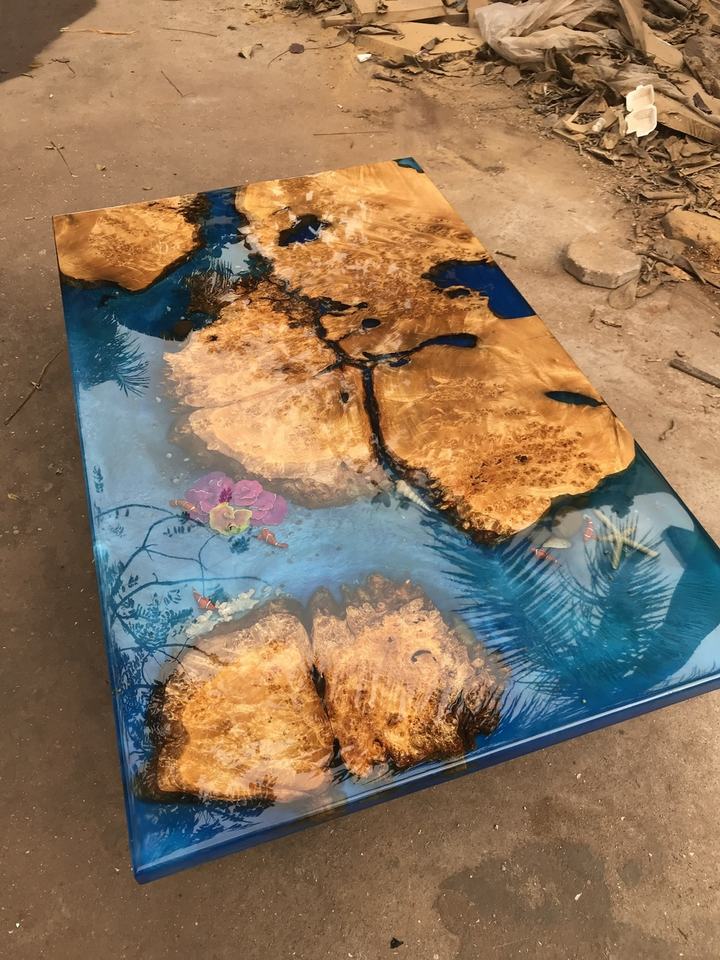 โต๊ะเรซิ่นลายแม่น้ำธีมมหาสมุทร 3 มิติ พร้อมตกแต่งด้วยสิ่งมีชีวิตใต้ทะเล โต๊ะกาแฟไม้เนื้อแข็งเคลือบเงาสูง