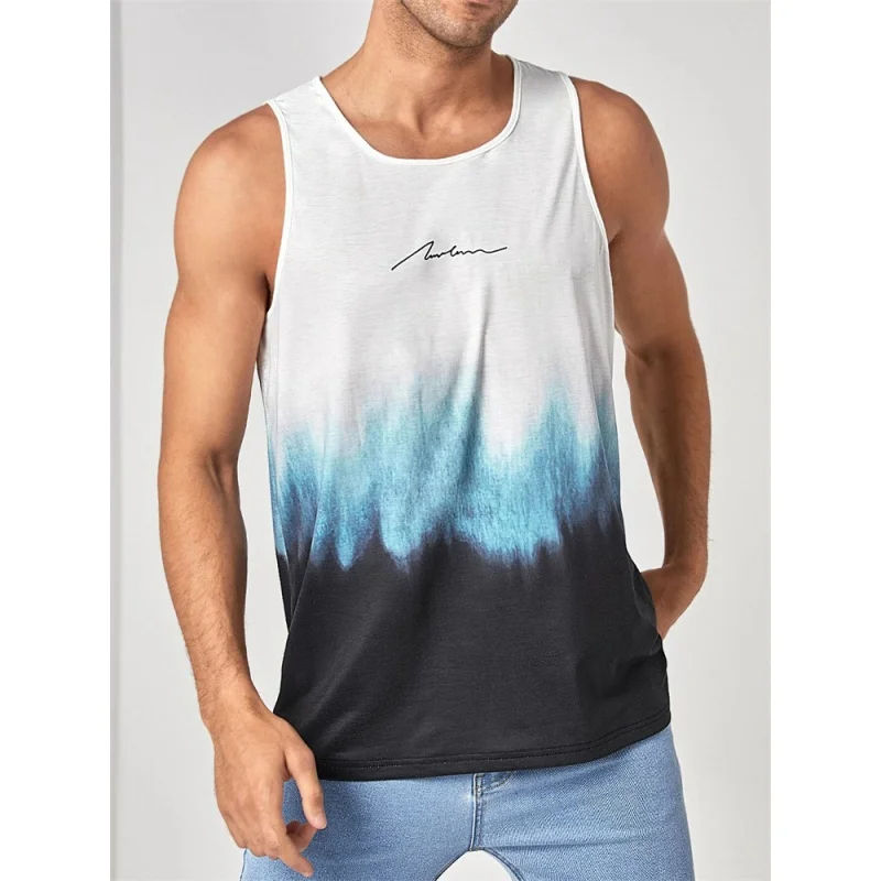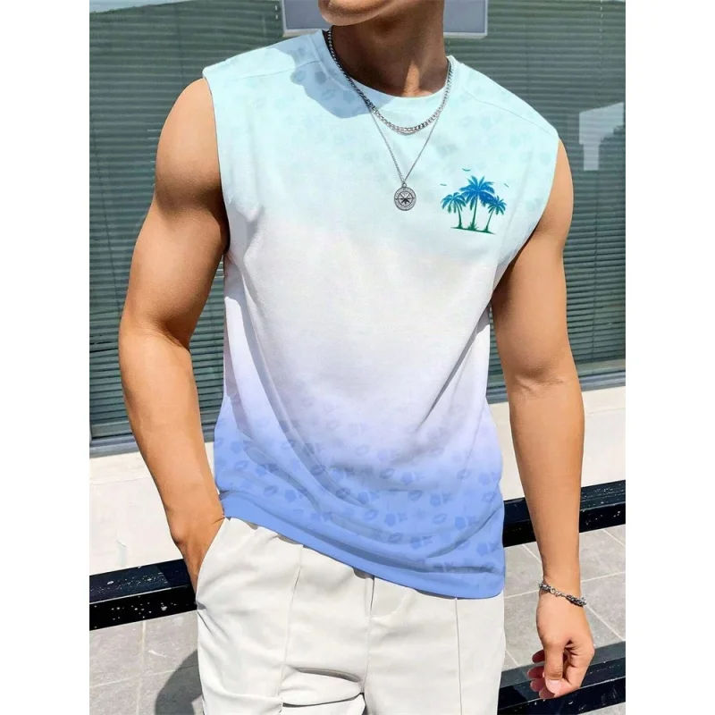 เสื้อกล้ามพิมพ์ลายต้นมะพร้าวสำหรับผู้ชายเสื้อไล่ระดับสีสีสันสดใสเสื้อกล้ามแนวสตรีทสำหรับเล่นกีฬาฤดูร้อน