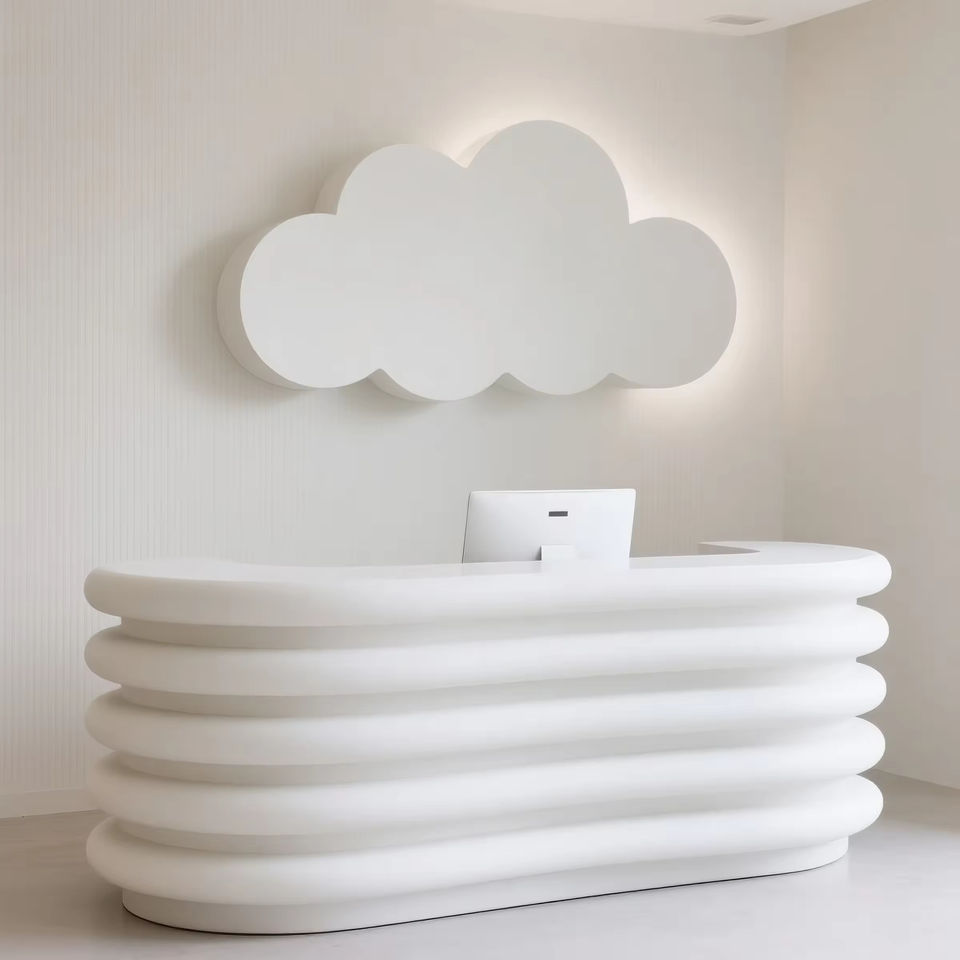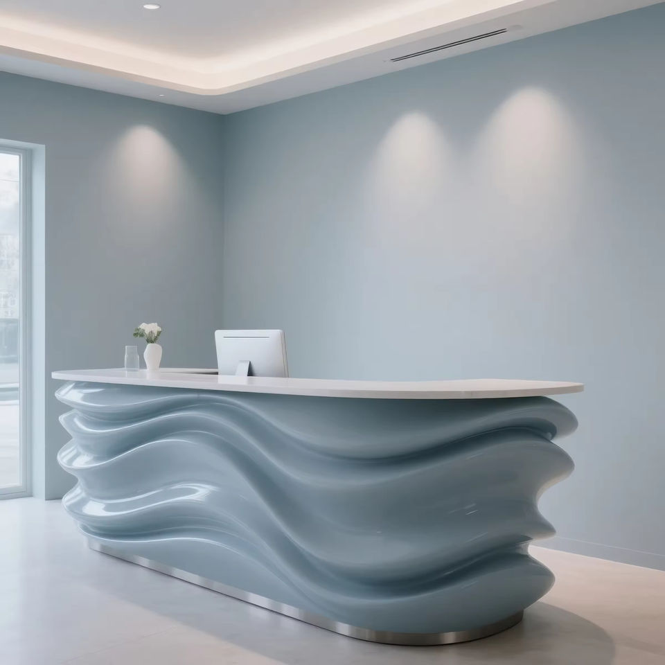3D Printed Light Blue Wave Modern Reception Desk with Smooth Curved Front and PETG Plastic Top for Hotels and Malls