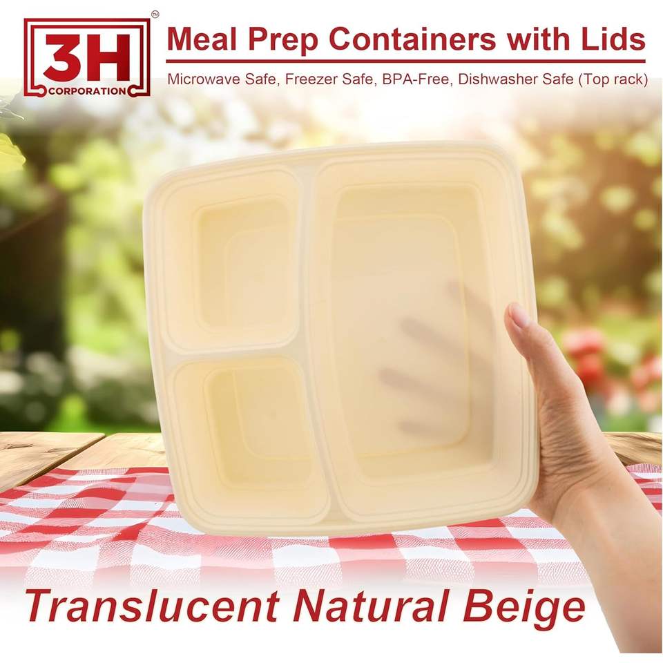 กล่องเตรียมอาหาร 3H ขนาด 45 ออนซ์ แบบ 3 ช่อง 100 กล่อง/ลัง, 200 ชิ้น พร้อมฝาปิด, กล่องอาหารแบบพกพา, ใช้กับไมโครเวฟ/เครื่องล้างจาน/ช่องแช่แข็งได้